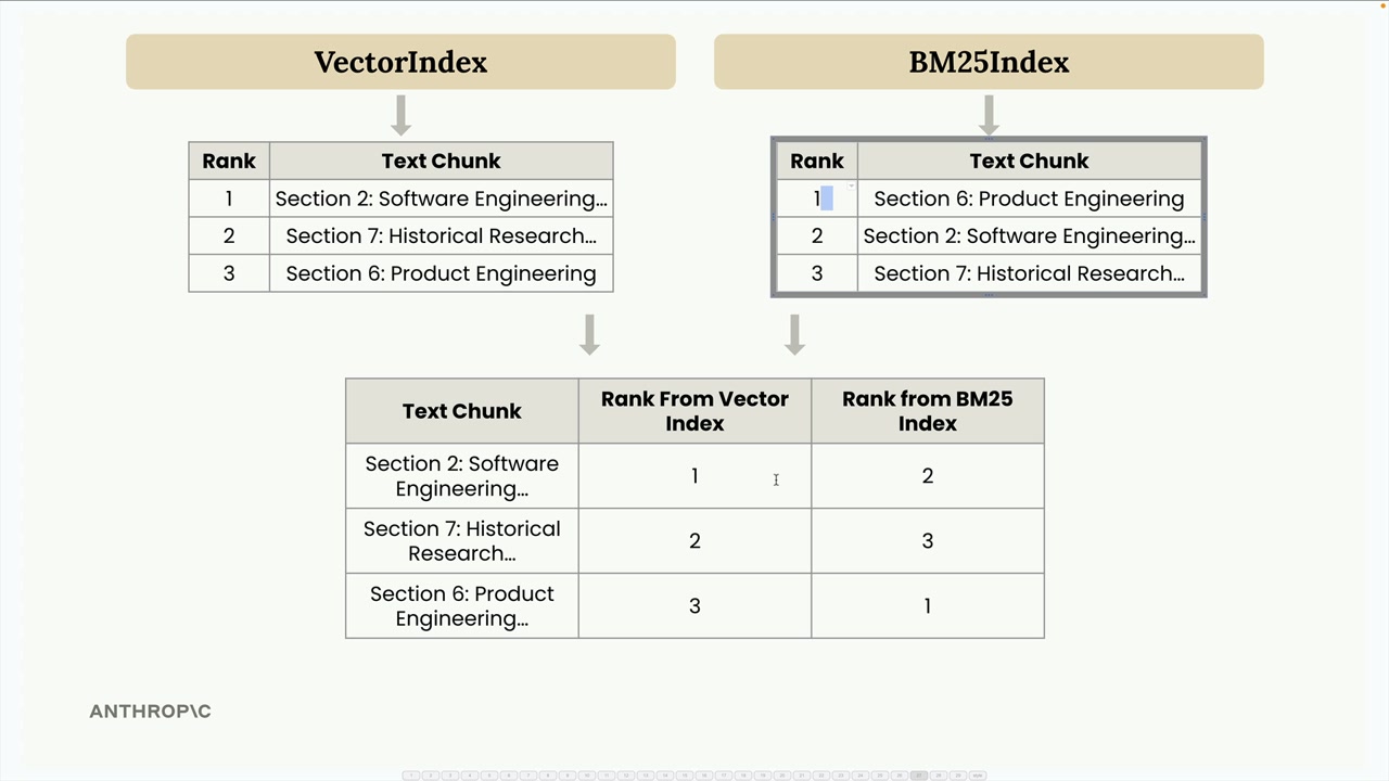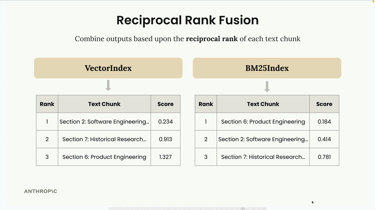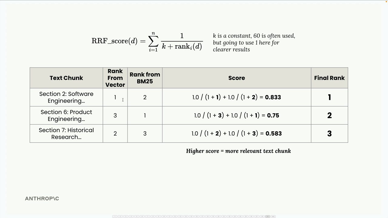 이를 하나의 표로 합쳐 각 텍스트 청크의 두 인덱스별 순위를 확인한 후, RRF 공식을 적용합니다: