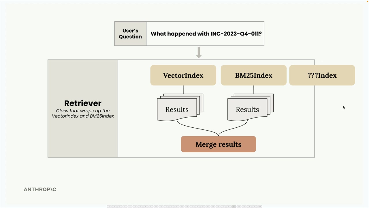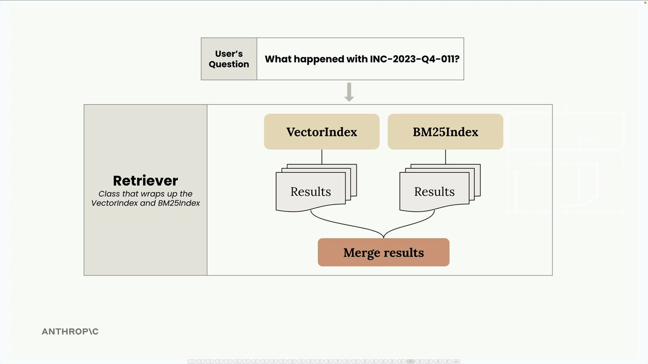 Retriever는 사용자 쿼리를 두 인덱스에 전달하고, 결과를 수집한 후 상호 순위 융합(reciprocal rank fusion)이라는 기법으로 병합하는 조율자 역할을 합니다.