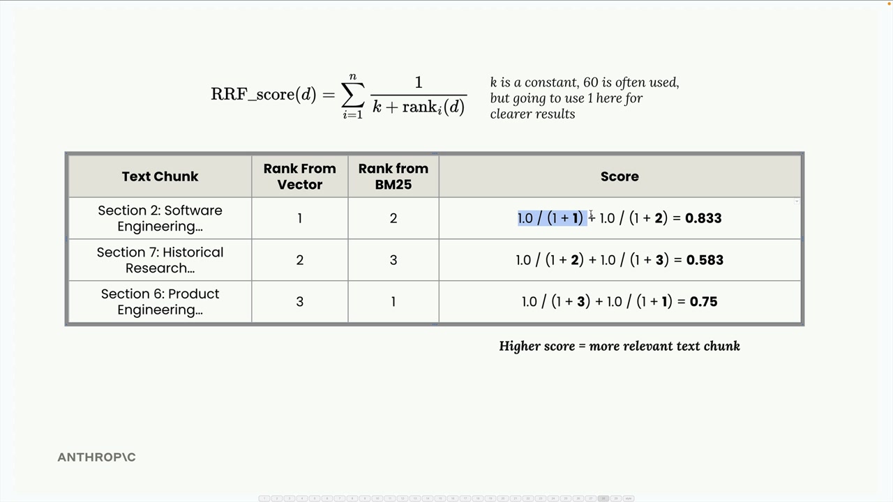 여기서 k는 상수(보통 60을 사용하지만, 여기서는 결과를 더 명확히 보기 위해 1을 사용합니다)이고, rank_i(d)는 i번째 순위 목록에서 문서 d의 순위입니다.