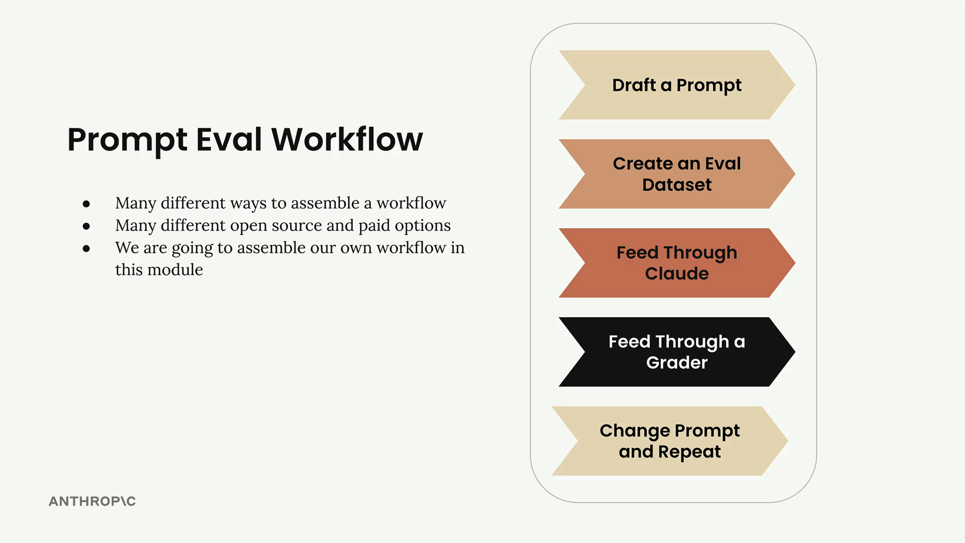 일반적인 프롬프트 평가 워크플로는 객관적인 측정을 통해 프롬프트를 체계적으로 개선할 수 있도록 돕는 다섯 가지 핵심 단계를 따릅니다. 이러한 워크플로를 구성하는 방법은 다양하며 오픈소스 및 유료 도구도 여러 가지가 있지만, 핵심 프로세스를 이해하면 작게 시작해서 필요에 따라 규모를 확장할 수 있습니다.