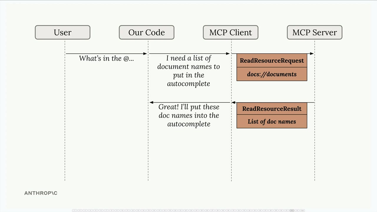 흐름은 간단합니다. 사용자가 "@report.pdf"와 같이 문서를 참조하려 할 때, 애플리케이션은 MCP 클라이언트를 사용해 서버에서 해당 리소스를 가져와 Claude에 전송되는 프롬프트에 직접 포함시킵니다.