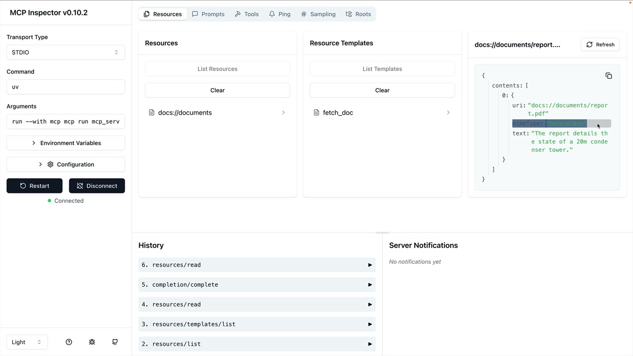 작성한 MCP 클라이언트 코드는 애플리케이션의 다른 부분에서도 사용됩니다. read_resource 함수는 다른 컴포넌트가 문서 콘텐츠 가져오기, 사용 가능한 리소스 목록 조회, 또는 리소스 데이터를 프롬프트에 통합하는 데 활용할 수 있는 기본 구성 요소가 됩니다.