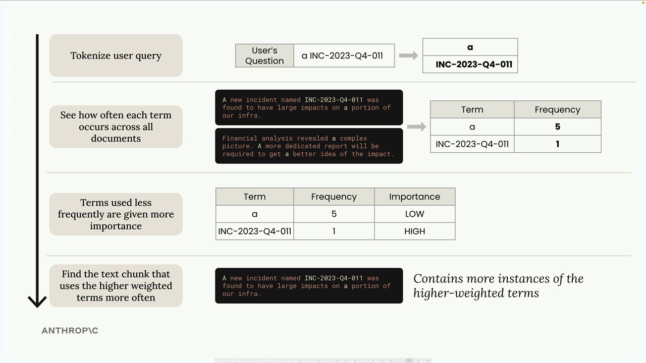 출현 빈도가 낮은 용어일수록 더 높은 중요도 점수를 받습니다. "a"라는 단어는 흔하기 때문에 낮은 중요도를 받고, "INC-2023-Q4-011"은 희귀하기 때문에 높은 중요도를 받습니다.