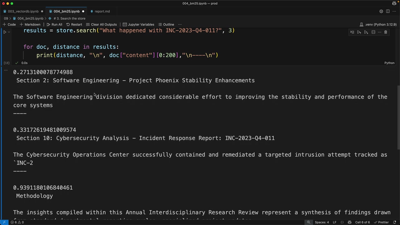 이 검색을 실행하면 의미 검색만 사용할 때보다 훨씬 더 나은 결과를 얻을 수 있습니다. BM25 알고리즘은 실제로 특정 검색어, 특히 사건 ID와 같은 희귀 용어를 포함하는 섹션을 우선시합니다.