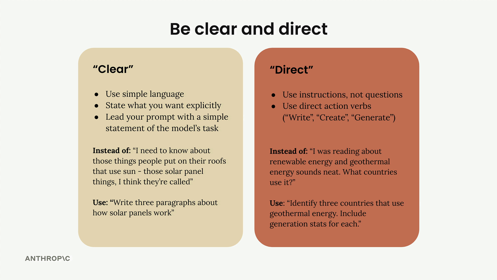 핵심적인 첫 번째 줄을 작성할 때는 두 가지 핵심 원칙인 명확성과 직접성에 집중해야 합니다. 즉, Claude에게 원하는 것에 대해 모호함이 없도록 간단한 언어를 사용해야 합니다.