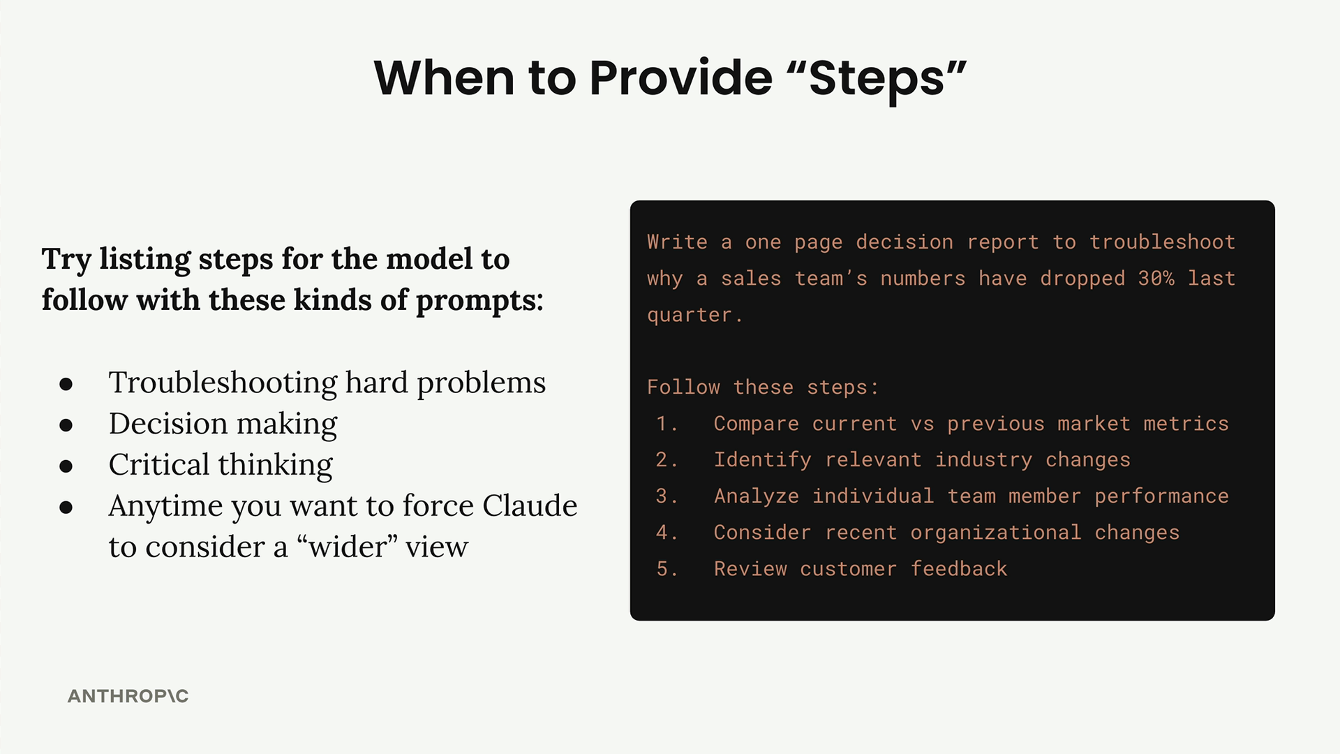 예를 들어, 영업팀의 성과가 왜 하락했는지 Claude에게 분석을 요청하는 경우, 단 하나의 잠재적 원인에만 집중하지 않고 시장 지표, 업계 변화, 개인 성과, 조직 변화, 고객 피드백을 검토하도록 안내하고 싶을 것입니다.
