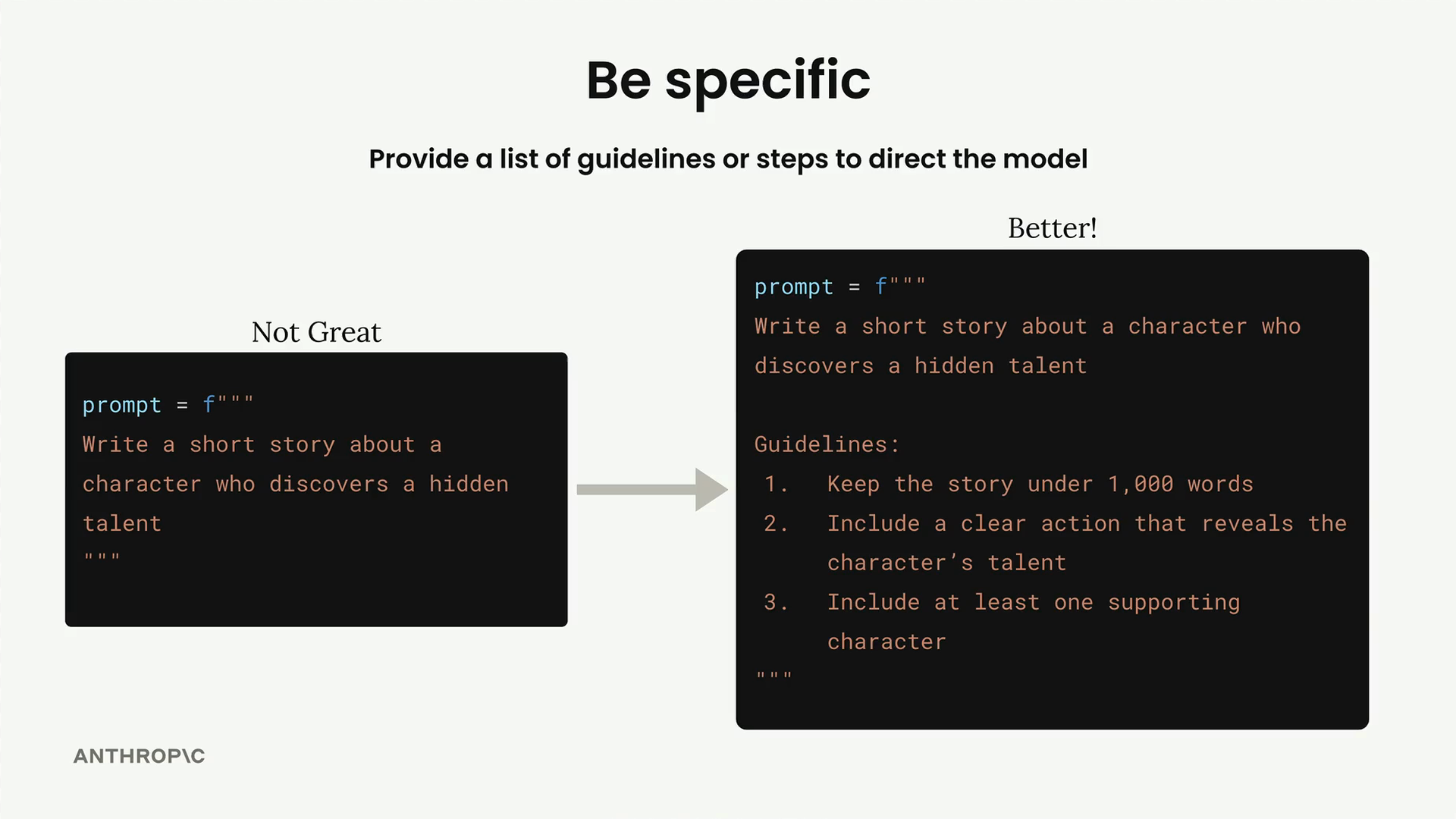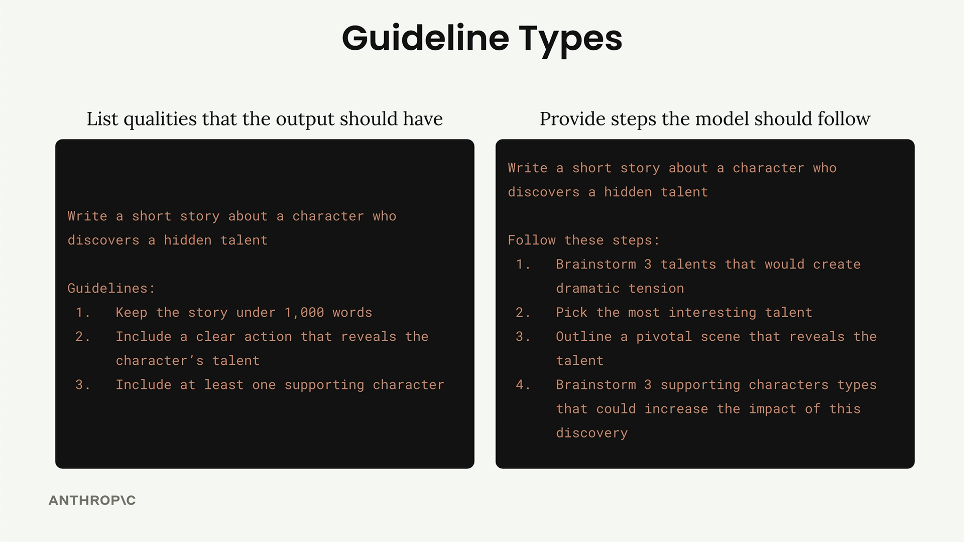 이렇게 생각해보세요: Claude에게 "숨겨진 재능을 발견하는 캐릭터에 대한 단편 소설을 써줘"라고 요청하면, Claude는 수없이 많은 방향으로 이야기를 전개할 수 있습니다. 소설이 200단어일 수도 있고 2,000단어일 수도 있습니다. 등장인물이 한 명일 수도 있고 다섯 명일 수도 있습니다. 어떤 종류의 재능 발견 시나리오에도 초점을 맞출 수 있습니다.