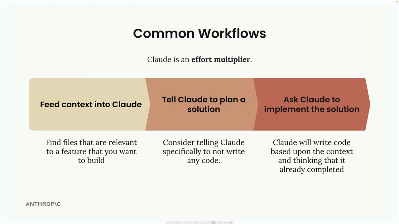 Claude는 노력 배가 도구로 접근할 때 가장 효과적입니다. 더 많은 컨텍스트와 구조를 제공할수록 더 나은 결과를 얻을 수 있습니다. 가장 효과적인 워크플로우는 다음과 같습니다: