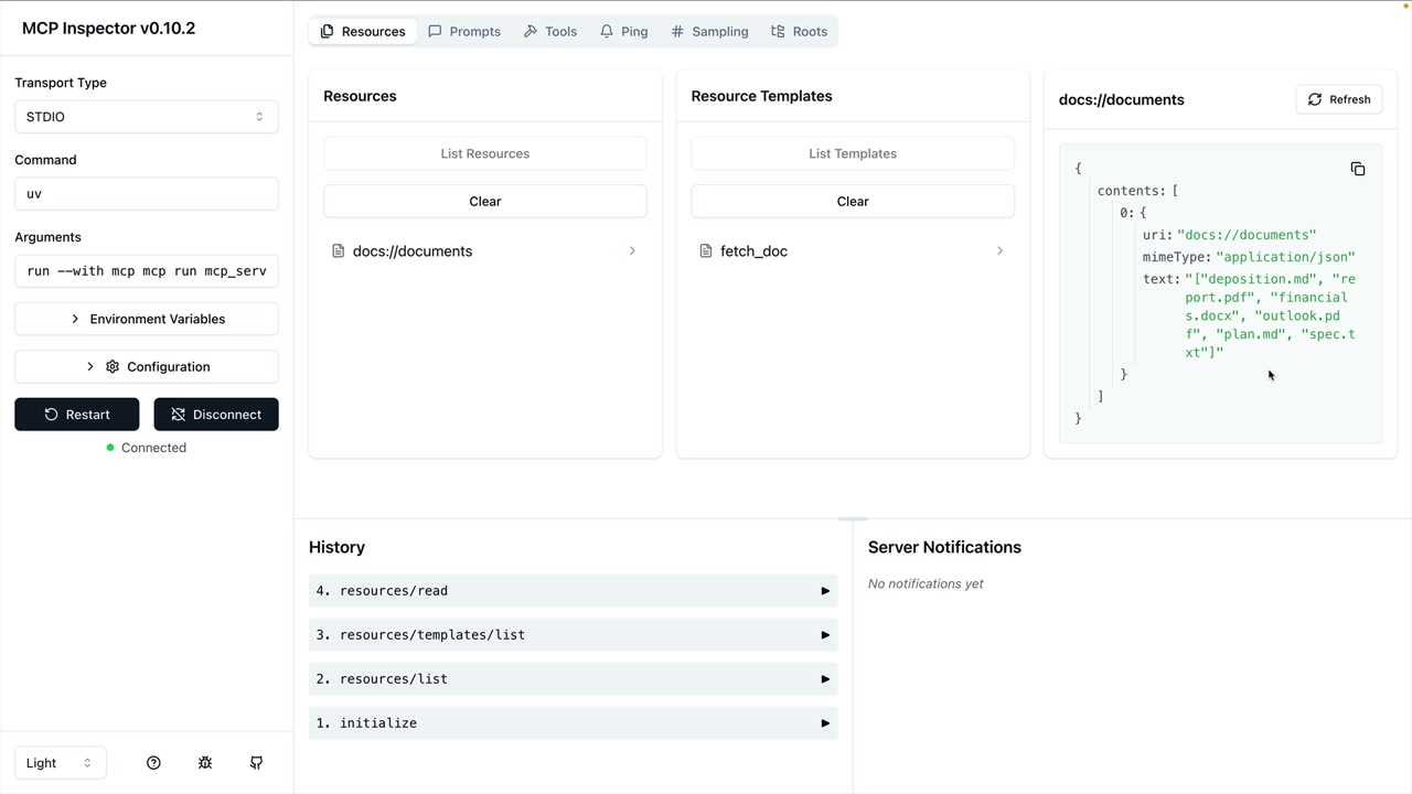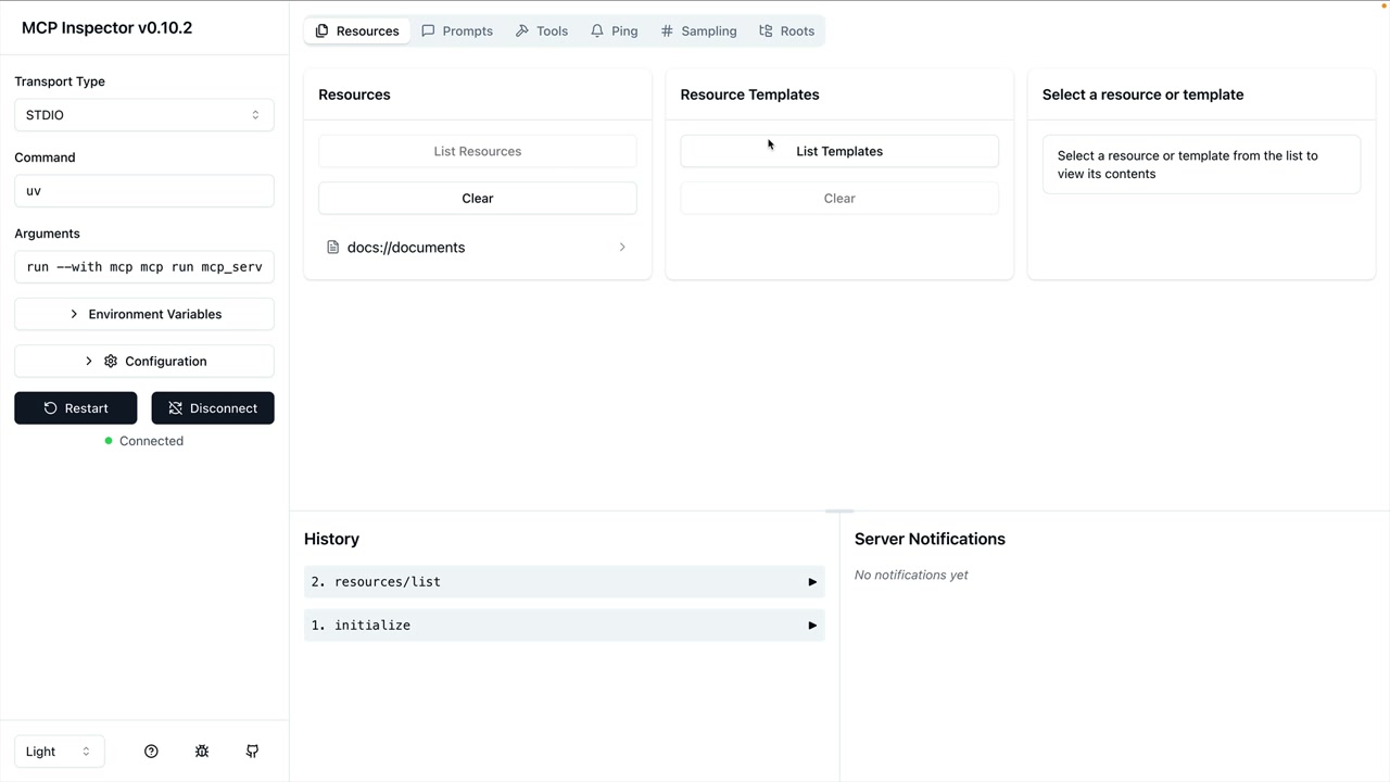 MCP Inspector를 사용해 리소스를 테스트할 수 있습니다. 다음 명령으로 서버를 실행하세요: