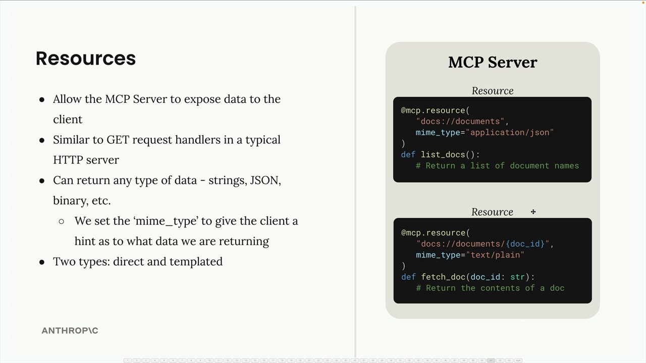 MCP 서버의 리소스는 일반적인 HTTP 서버의 GET 요청 핸들러와 유사하게, 클라이언트에 데이터를 노출할 수 있게 해줍니다. 액션을 수행하는 것이 아니라 정보를 가져와야 하는 상황에 이상적입니다.