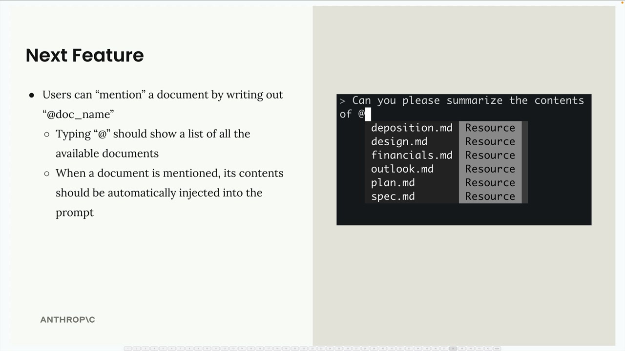 사용자가 @를 입력하면 사용 가능한 문서를 표시해야 합니다. 멘션이 포함된 메시지를 전송하면 해당 문서의 내용이 Claude에게 전달되는 프롬프트에 자동으로 삽입됩니다.