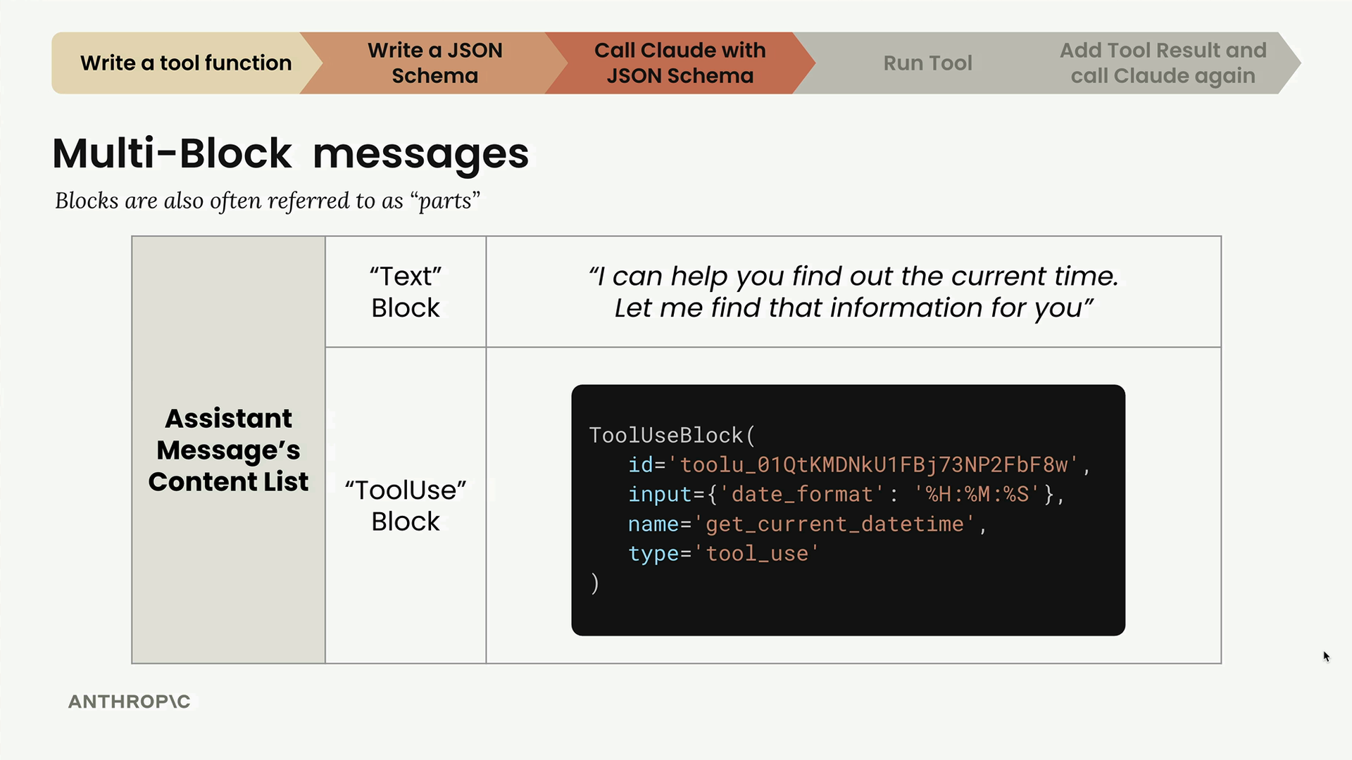 Claude가 도구를 사용하기로 결정하면, 콘텐츠 목록에 여러 블록이 포함된 어시스턴트 메시지를 반환합니다. 이는 이전에 다루던 단순한 텍스트 전용 응답과 크게 다른 점입니다.