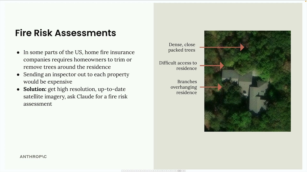 다음은 실용적인 적용 사례입니다: 주택 보험을 위한 화재 위험 평가 자동화. 모든 부동산에 조사원을 파견하는 대신, 보험사는 위성 이미지와 Claude의 분석을 활용할 수 있습니다.