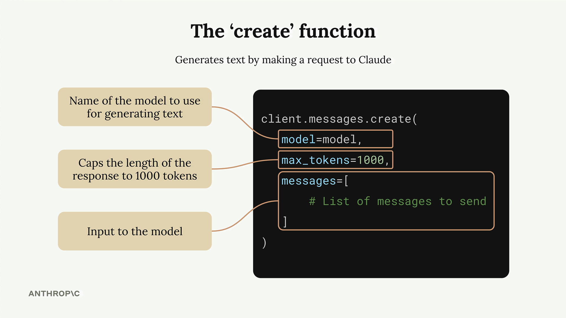 API 요청의 핵심은 client.messages.create() 함수입니다. 이 함수에는 세 가지 주요 매개변수가 필요합니다: