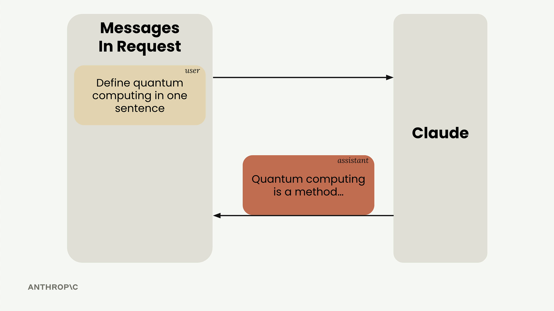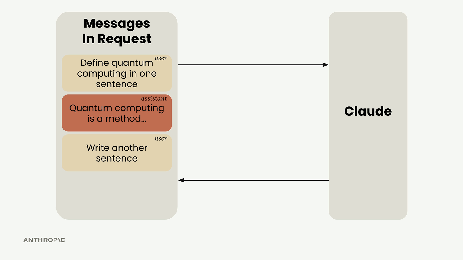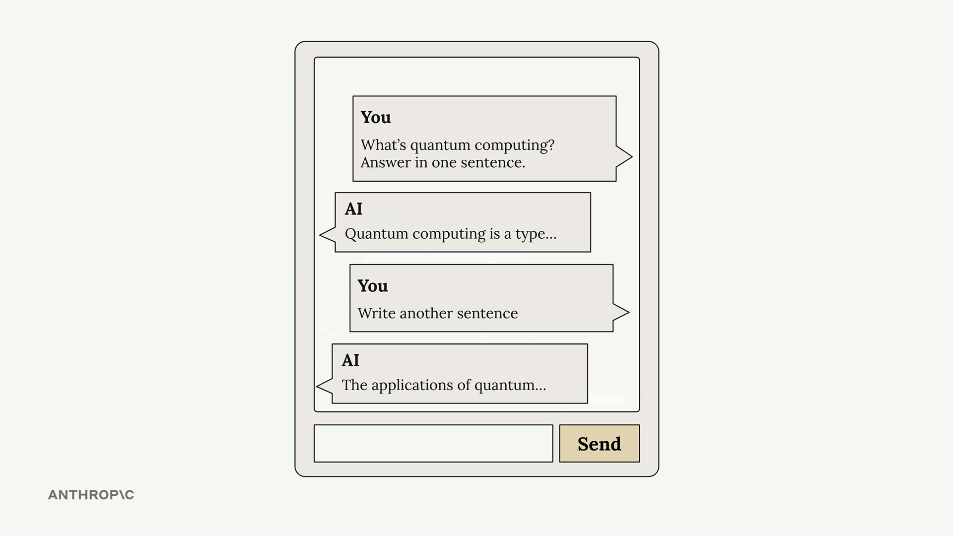 예를 들어 Claude에게 "양자 컴퓨팅이란 무엇인가요?"라고 물어서 좋은 답변을 받았다고 가정해봅시다. 그런 다음 "다른 문장을 하나 더 써주세요"라고 후속 질문을 하면, Claude는 무엇을 가리키는지 전혀 알지 못합니다. 양자 컴퓨팅에 대한 논의를 기억하지 못하므로 완전히 무작위한 주제로 문장을 작성할 것입니다.