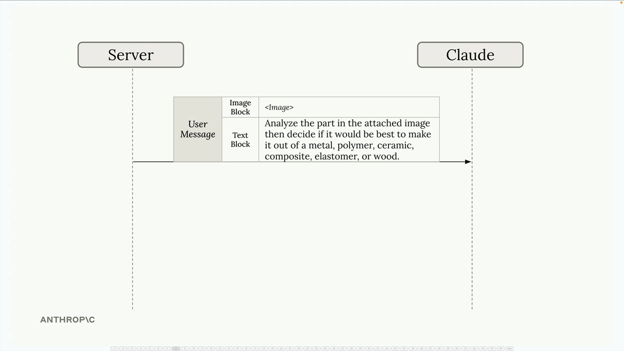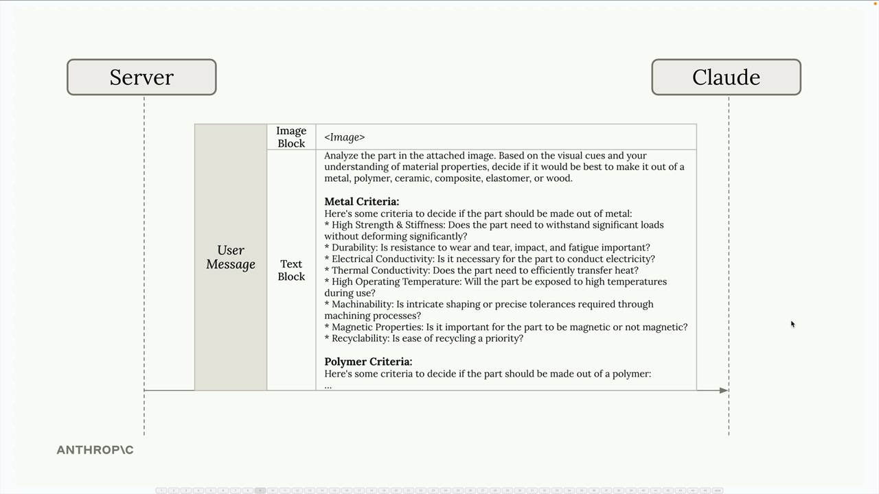 사용자가 부품 이미지를 업로드하면 사용하기에 가장 적합한 소재를 추천받는 소재 설계 애플리케이션을 만든다고 상상해 보세요. 처음에는 금속, 폴리머, 세라믹, 복합재료, 엘라스토머, 또는 목재 중에서 선택하도록 Claude에게 간단한 프롬프트와 함께 이미지를 보내는 방법을 떠올릴 수 있습니다.
