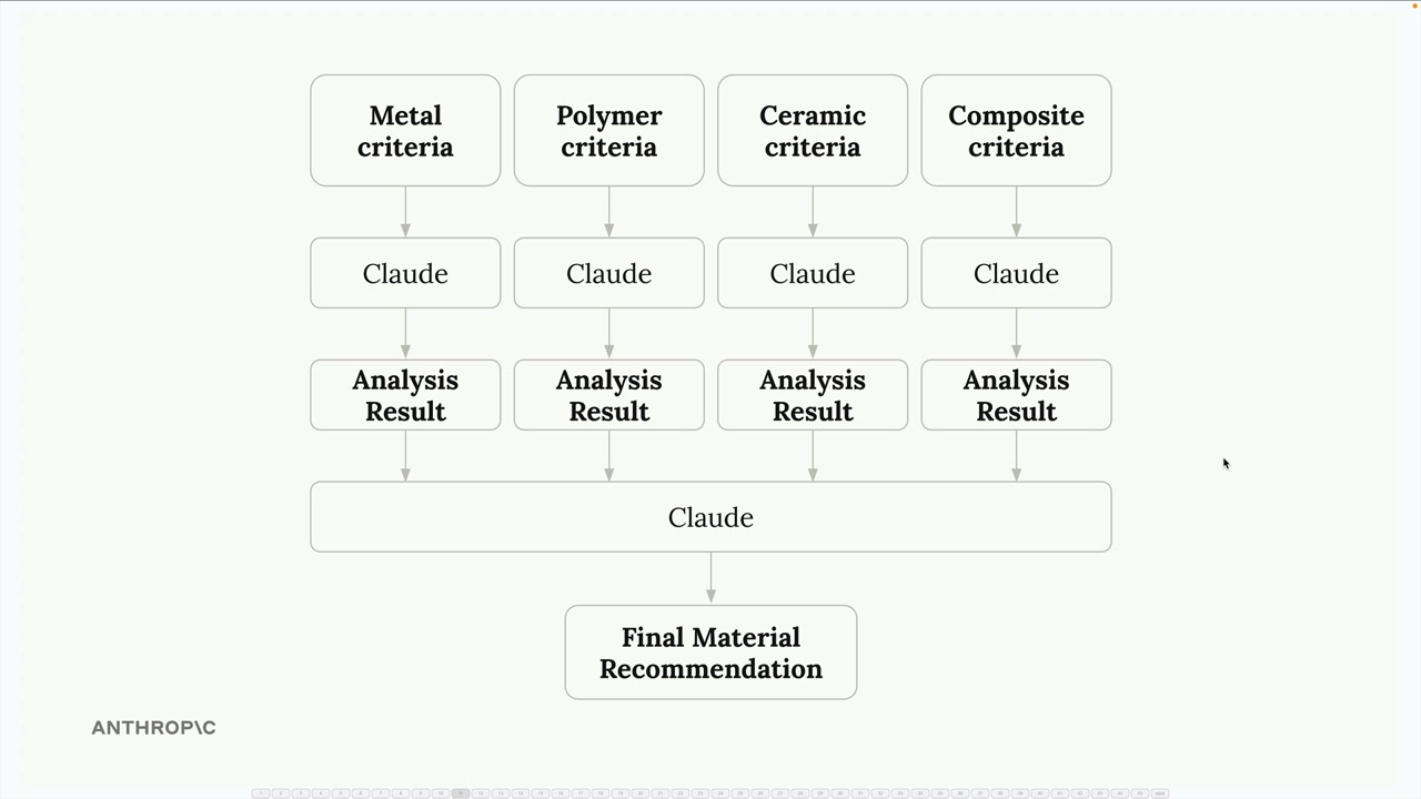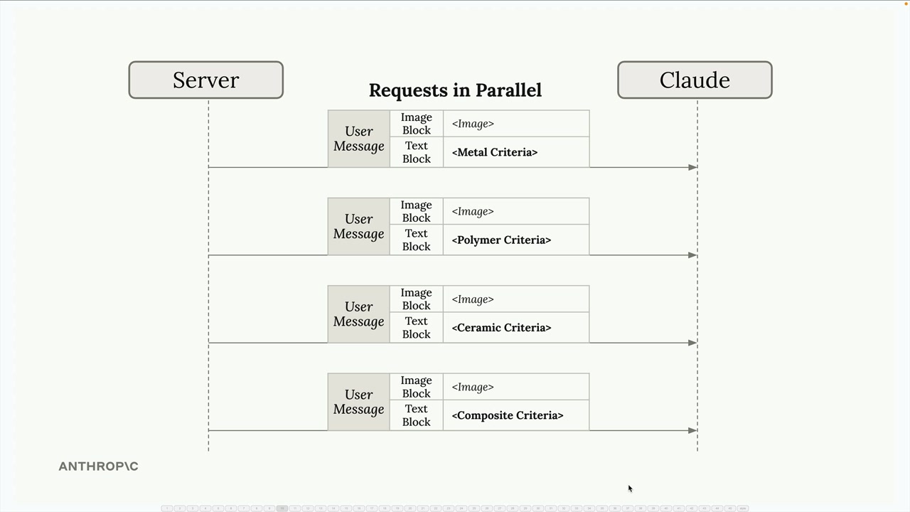 모든 것을 하나의 요청에 몰아넣는 대신, 작업을 여러 개의 병렬 요청으로 분할할 수 있습니다. 각 요청은 특화된 기준을 사용하여 단일 소재 유형에 대한 부품 평가에 집중합니다.