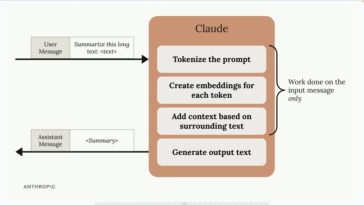 Claude에 메시지를 보내면 Claude는 즉시 응답을 생성하지 않습니다. 대신 입력에 대해 방대한 양의 전처리 작업을 수행합니다: