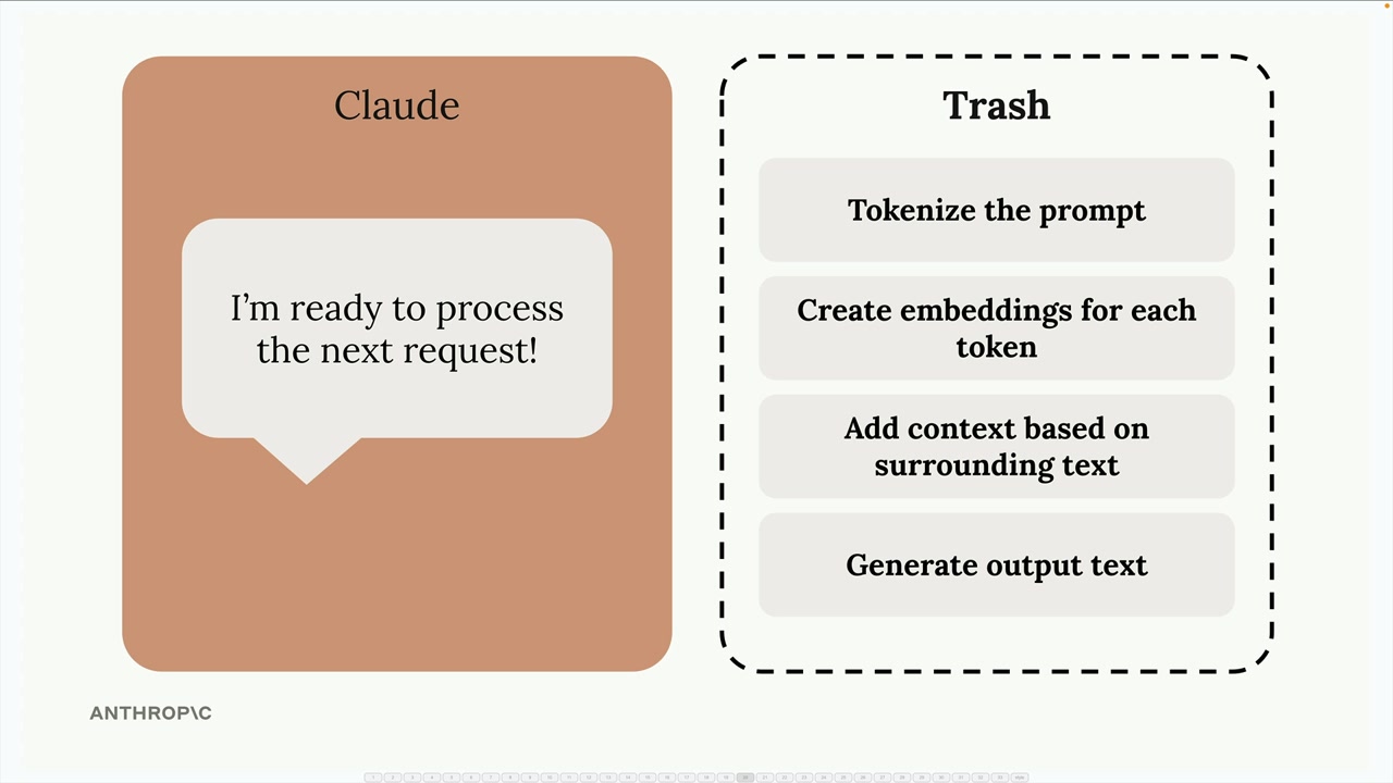 응답을 보낸 후, Claude는 이 모든 연산 작업을 버립니다 - 토크나이제이션, 임베딩, 맥락 분석 모두 폐기됩니다.