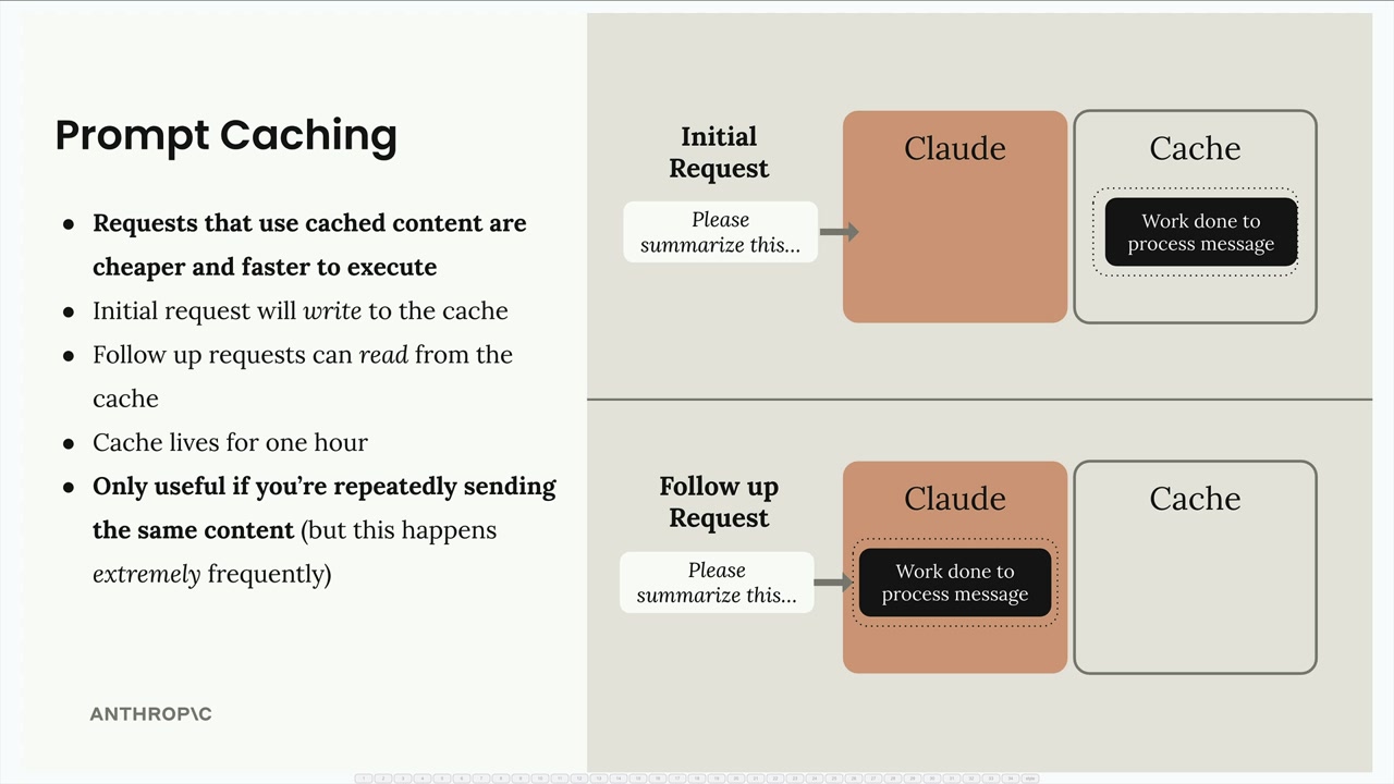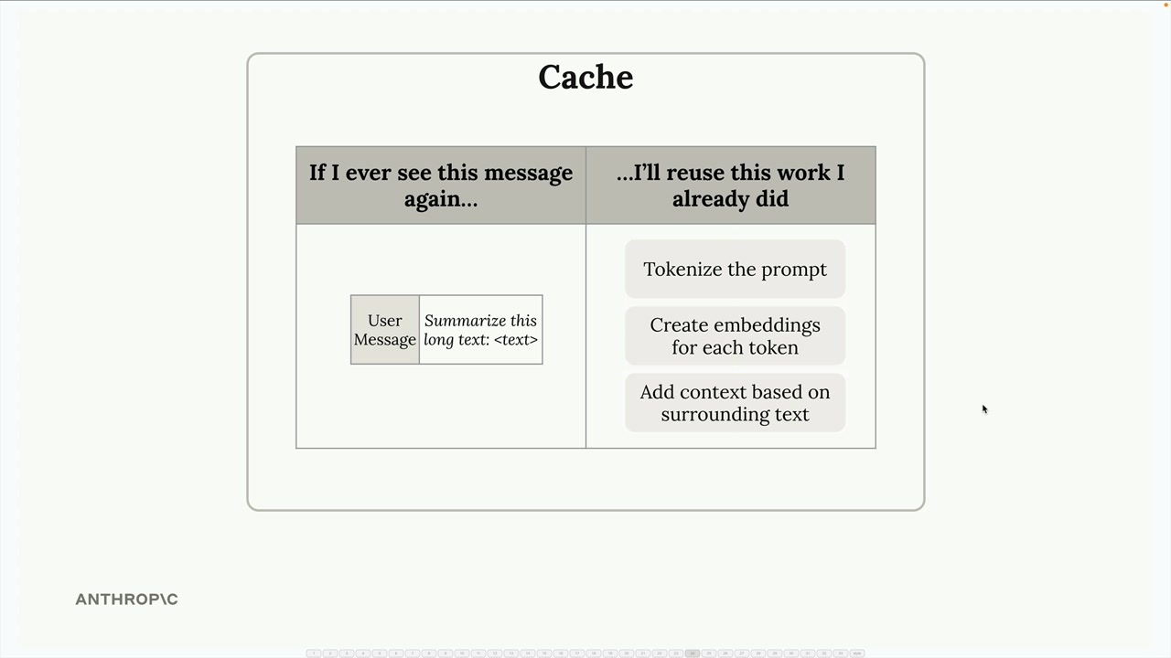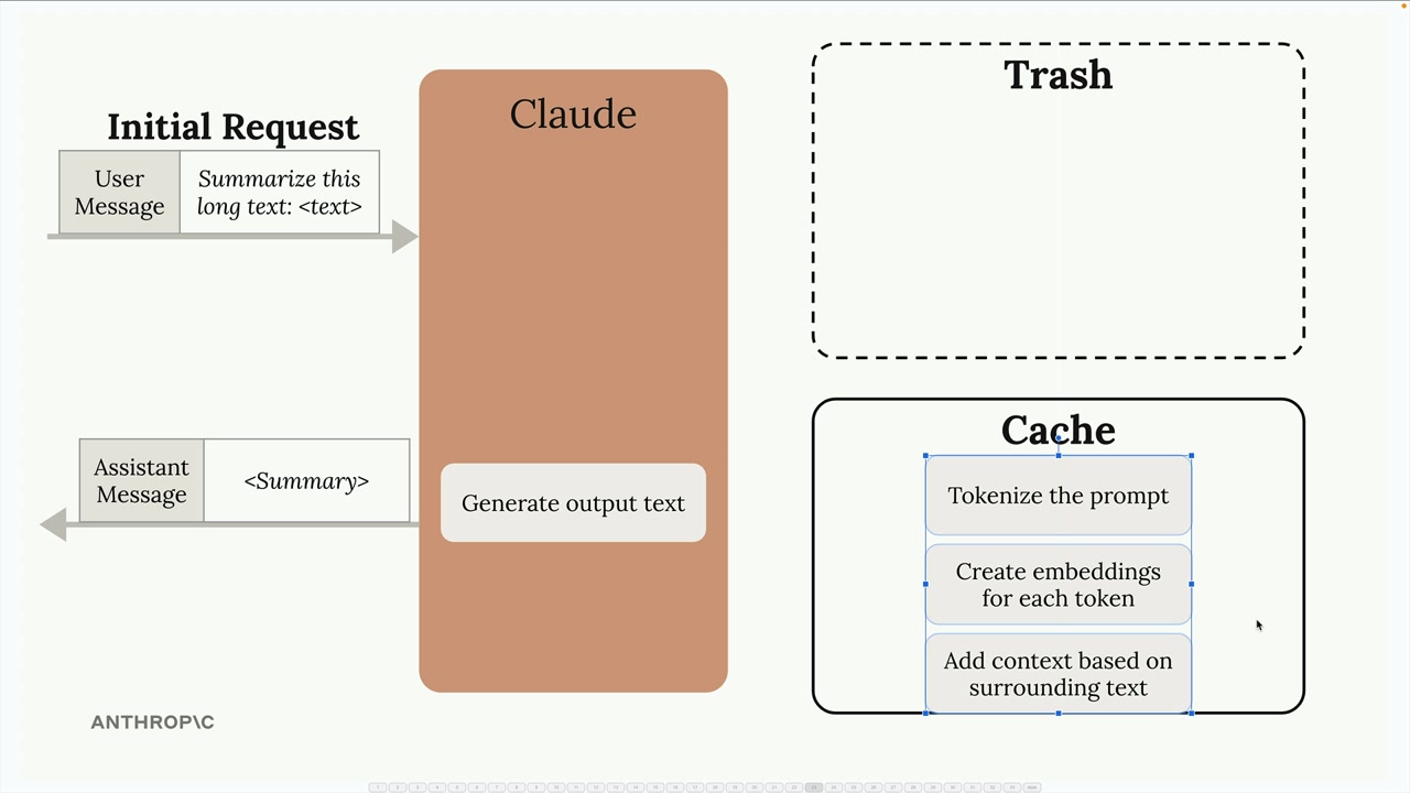 초기 요청을 보내면 Claude는 모든 일반적인 전처리를 수행하지만 결과를 버리는 대신 캐시에 저장합니다. 캐시는 "이 메시지를 다시 보면 이미 한 작업을 재사용하겠다"고 말하는 조회 테이블처럼 작동합니다.