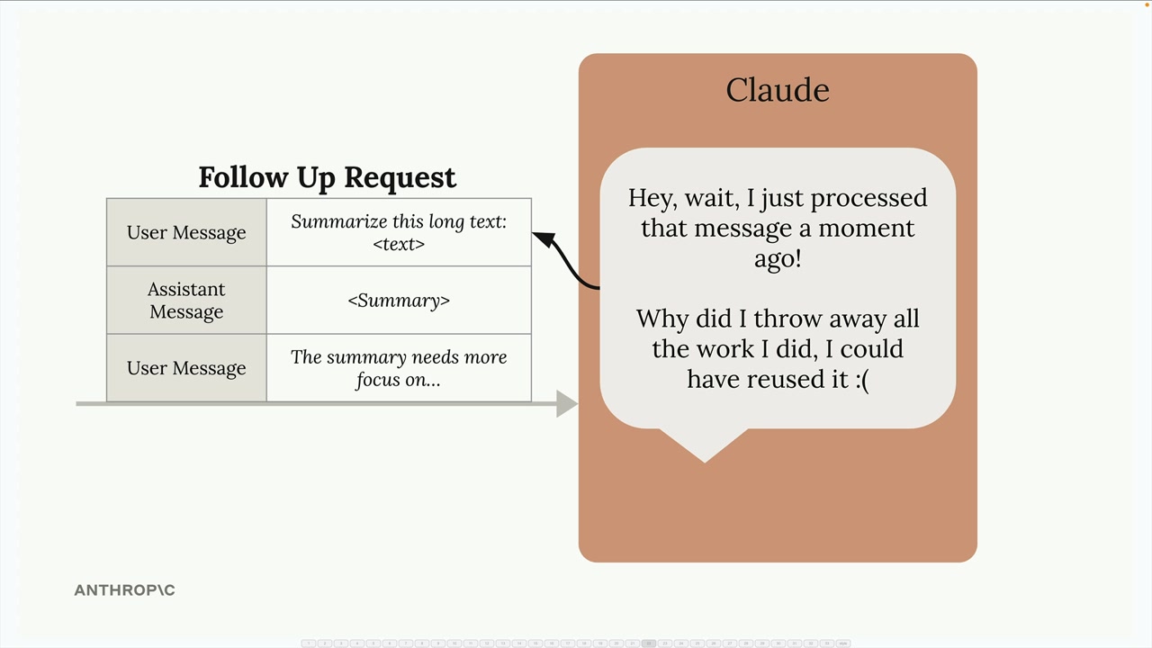 Claude는 방금 분석한 내용에 대해 동일한 전처리 작업을 반복해야 합니다. Claude는 스스로 이렇게 생각할 수 있습니다: "방금 그 메시지를 처리하고 했던 작업을 모두 버렸는데 - 재사용할 수 있었을 텐데!"