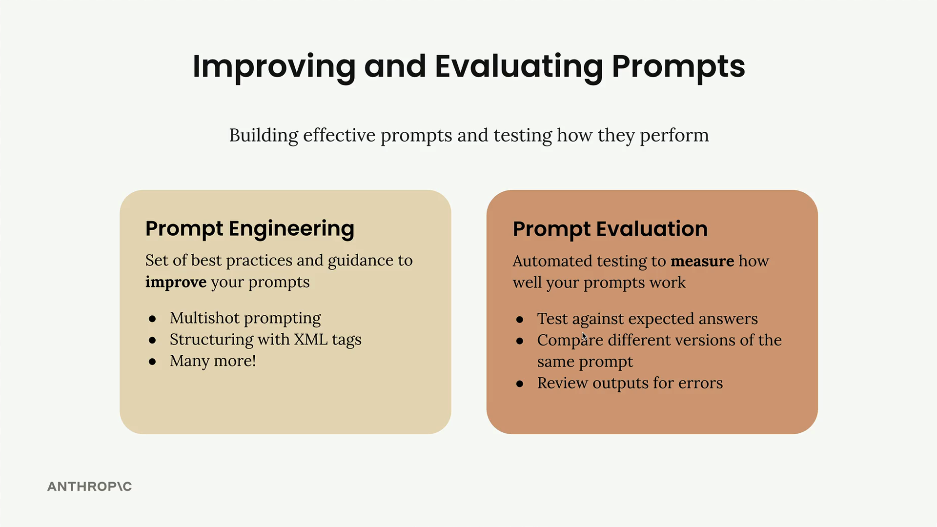 Claude와 함께 작업할 때, 좋은 프롬프트를 작성하는 것은 시작에 불과합니다. 신뢰할 수 있는 AI 애플리케이션을 구축하려면 두 가지 핵심 개념을 이해해야 합니다: 프롬프트 엔지니어링과 프롬프트 평가입니다. 프롬프트 엔지니어링은 더 나은 프롬프트를 작성하는 기법을 제공하고, 프롬프트 평가는 해당 프롬프트가 실제로 얼마나 잘 작동하는지 측정하는 데 도움을 줍니다.