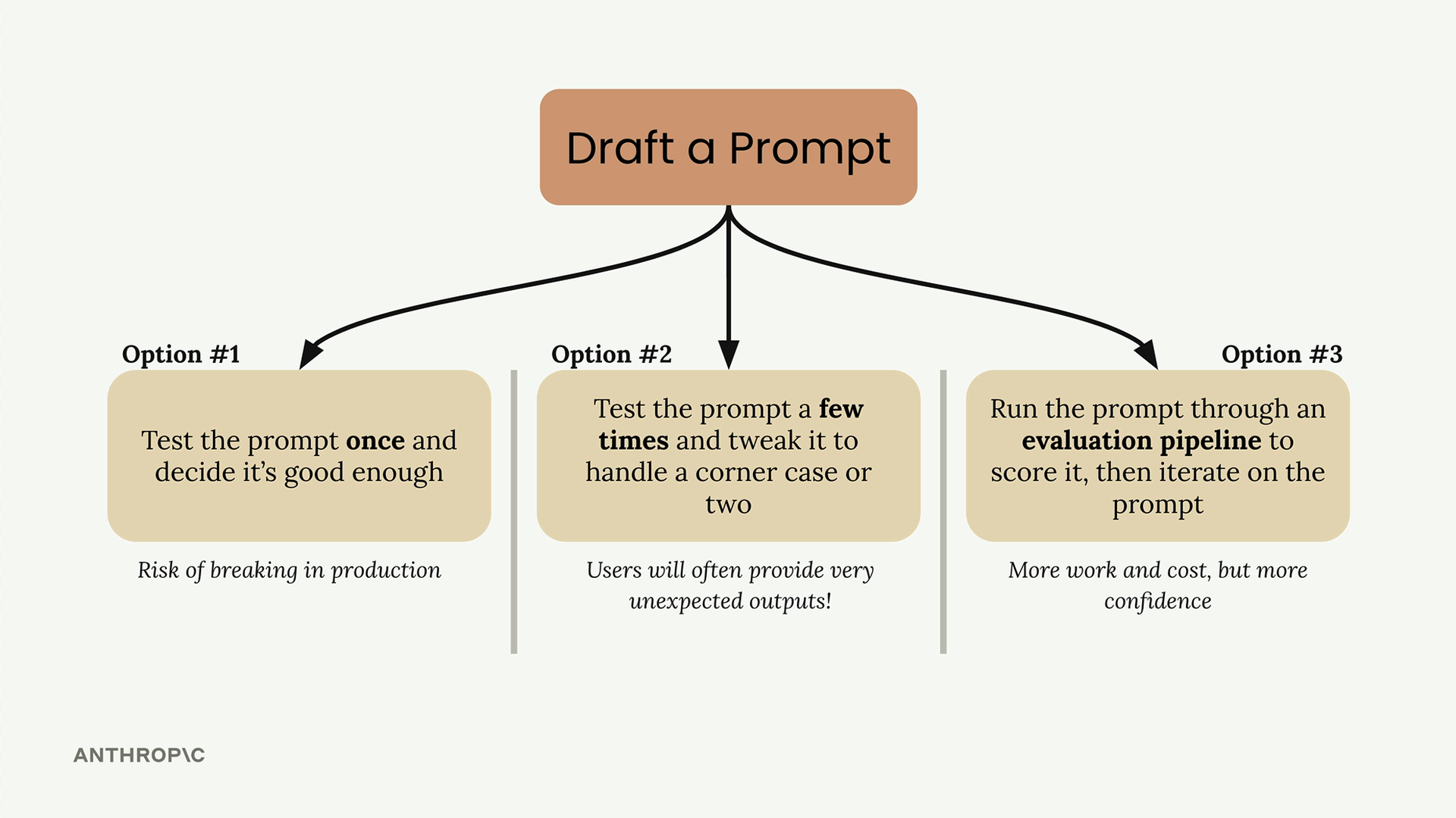 옵션 1: 프롬프트를 한 번 테스트하고 충분히 좋다고 판단하는 것입니다. 이는 사용자가 예상치 못한 입력을 제공할 때 프로덕션에서 문제가 발생할 상당한 위험을 내포합니다.