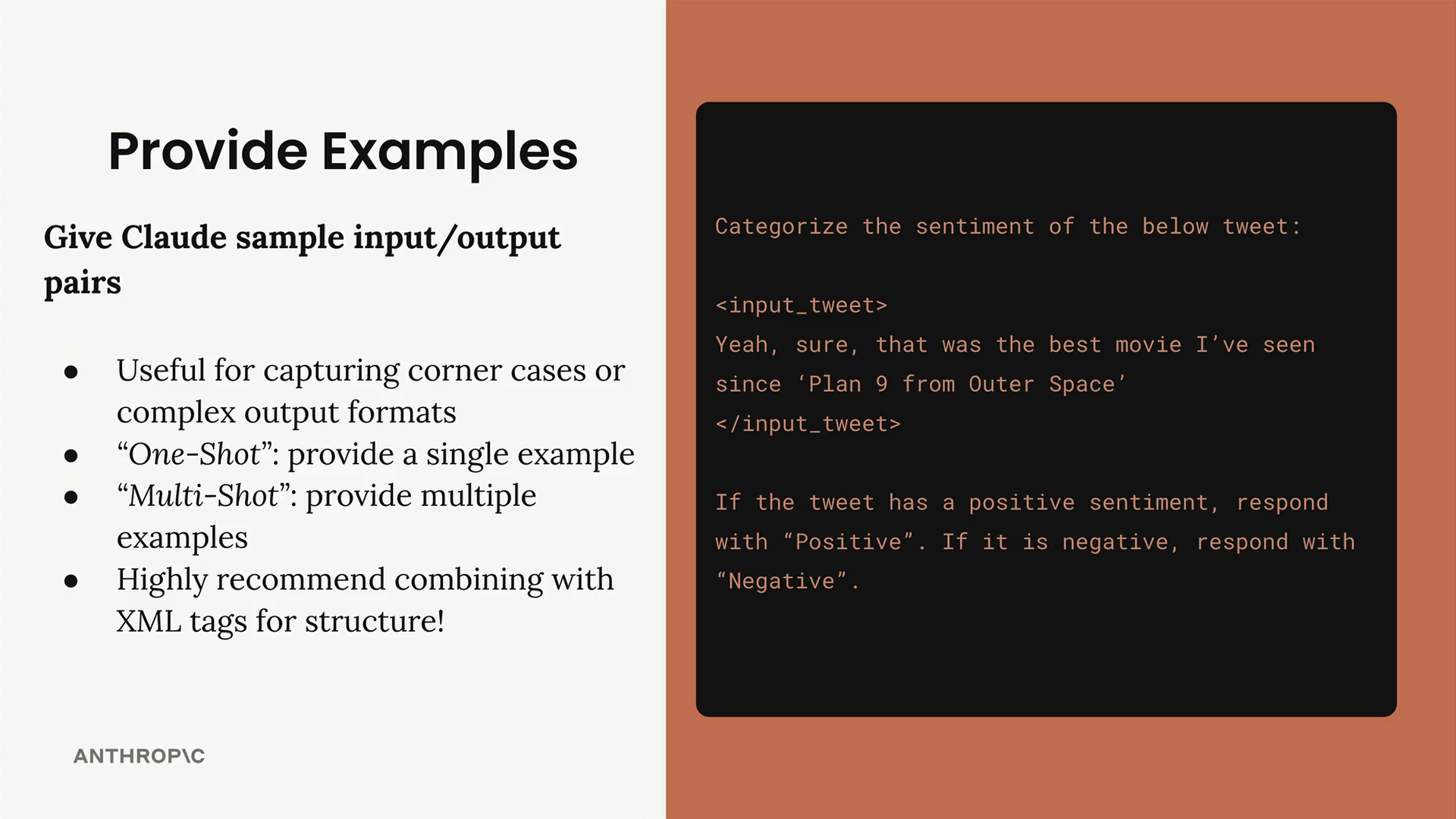 예시는 말로 설명하는 대신 직접 보여주기 때문에 특히 강력합니다. 원하는 것을 말로 정확하게 묘사하려는 대신, 직접 시연합니다. 이를 통해 프롬프트가 훨씬 더 신뢰할 수 있게 되고, 지시사항만으로는 표현하기 어려운 미묘한 요구사항을 Claude가 이해하는 데 도움이 됩니다.