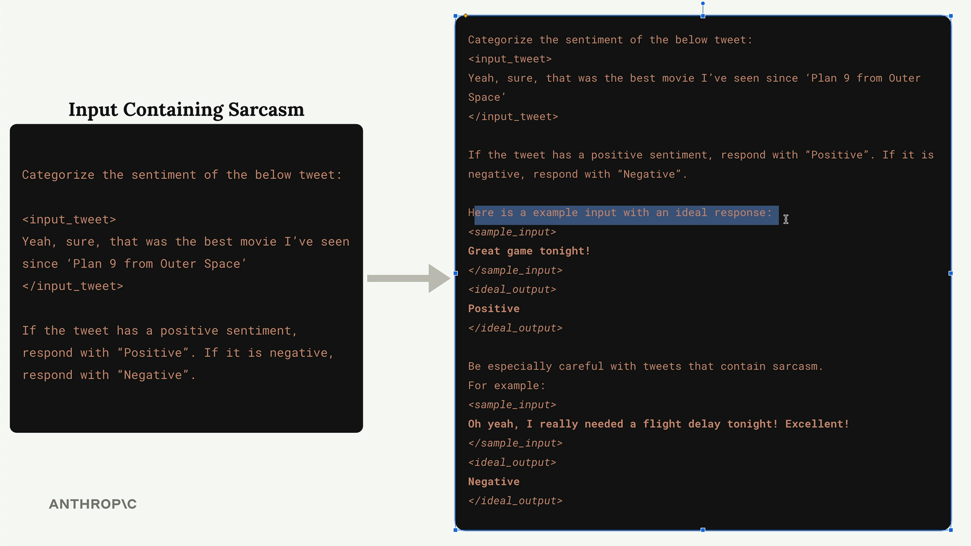 감정 분석 예시를 살펴보겠습니다. 트윗이 긍정적인지 부정적인지 분류하도록 Claude에게 요청한다고 가정해 봅시다: