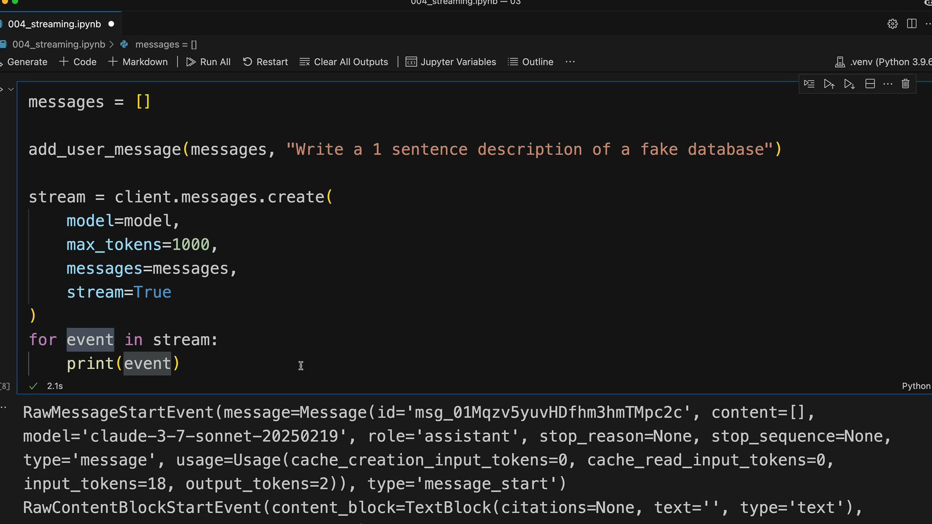 스트리밍이 활성화되면 Claude는 요청을 받았으며 텍스트 생성을 시작한다는 초기 응답을 즉시 돌려보냅니다. 그런 다음 전체 응답의 작은 조각을 담은 일련의 이벤트를 수신하게 됩니다.