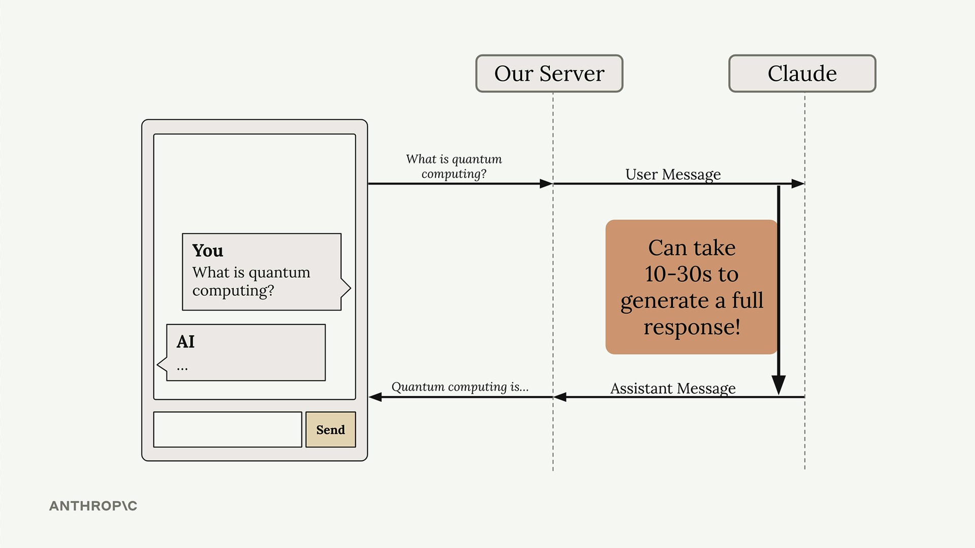 일반적인 채팅 구성에서는 서버가 사용자 메시지를 Claude에 전송하고 클라이언트에 무언가를 돌려보내기 전에 완전한 응답을 기다립니다. 이로 인해 사용자가 아무것도 진행되고 있지 않다는 피드백을 받지 못하는 어색한 지연이 발생합니다.