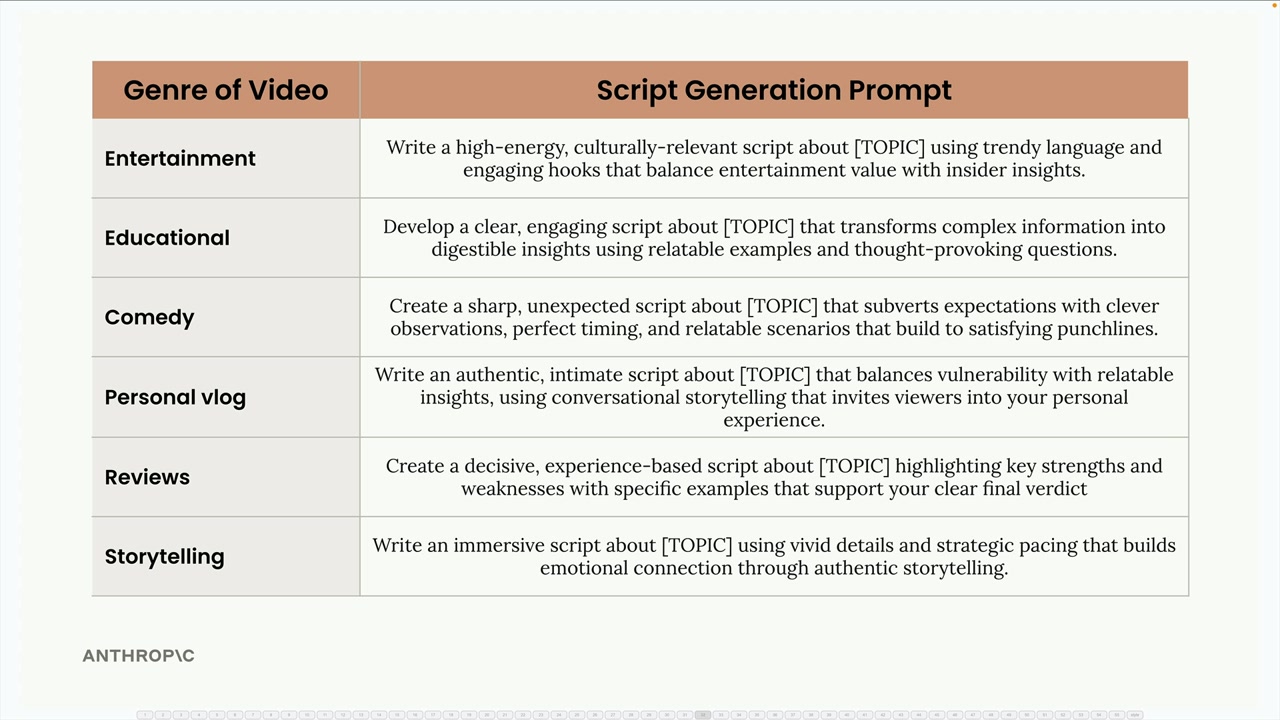 각 카테고리에는 자체적인 전문 프롬프트 템플릿이 있습니다. 예를 들어, 교육 프롬프트는 Claude에게 "공감 가는 예시와 생각을 자극하는 질문을 사용하여 복잡한 정보를 소화하기 쉬운 인사이트로 변환하는 명확하고 흥미로운 스크립트를 개발하라"고 요청할 수 있습니다.