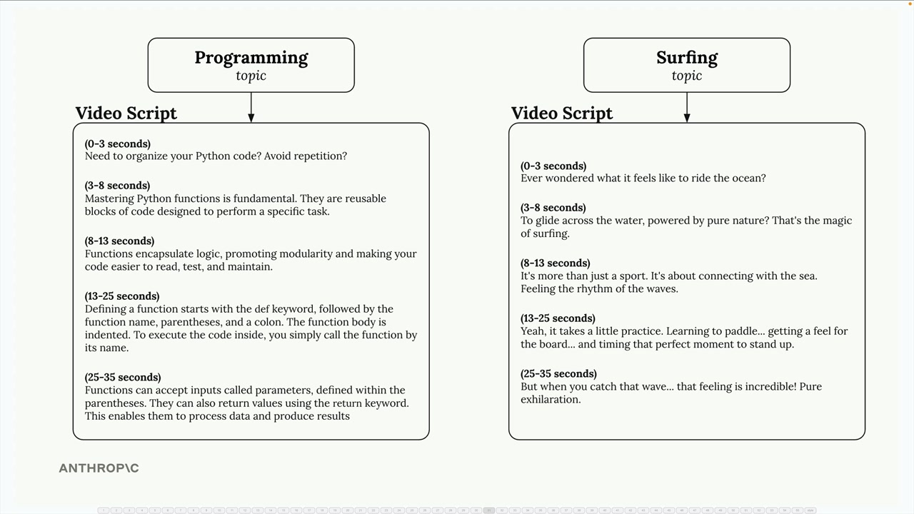 프로그래밍 주제는 명확한 설명과 정의가 있는 교육적 콘텐츠를 필요로 합니다. 서핑 주제는 흥미와 시각적 매력을 강조하는 엔터테인먼트 중심의 스크립트가 더 적합합니다. 단일 범용 프롬프트로는 두 가지를 효과적으로 처리할 수 없습니다.