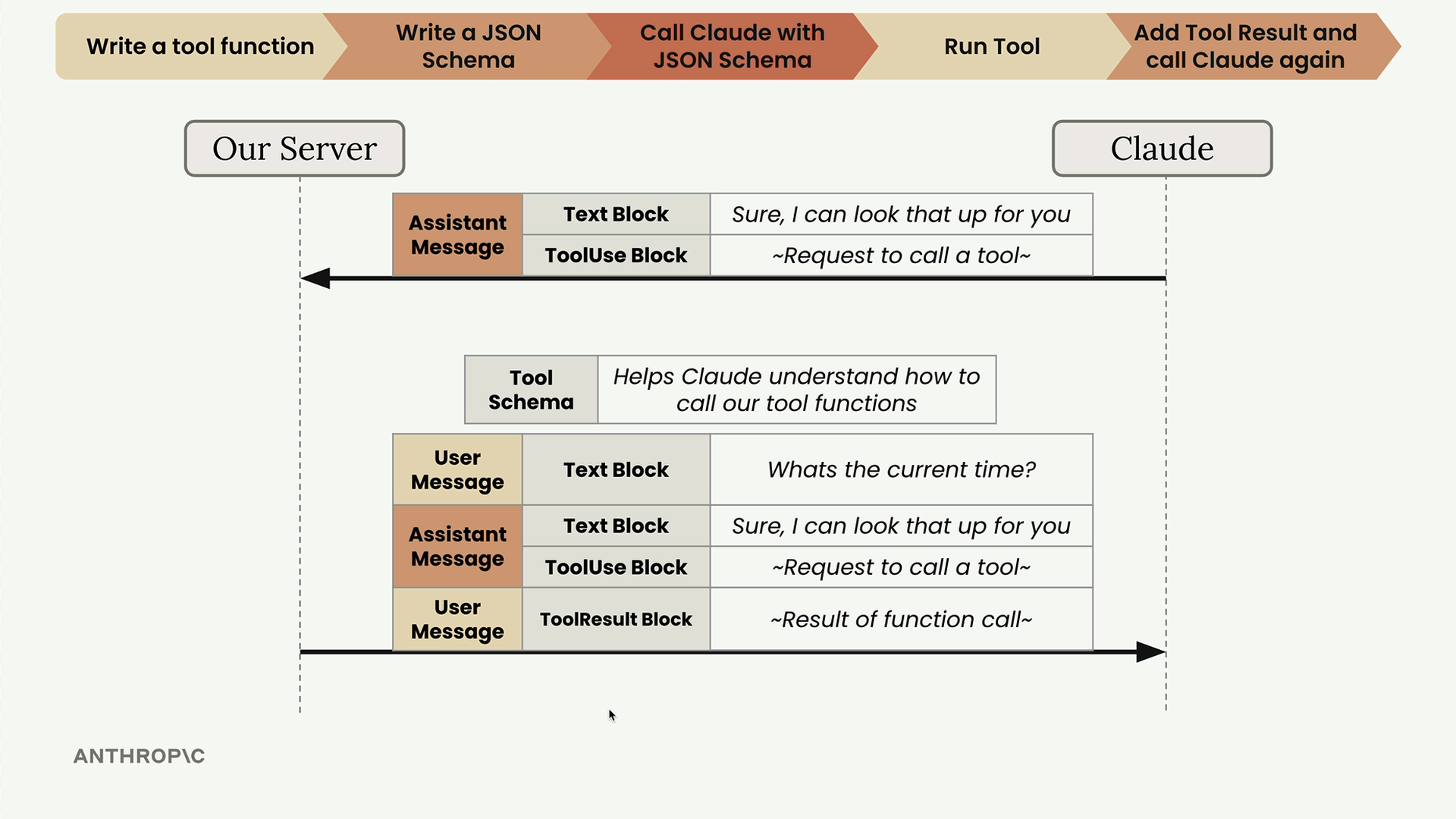 Claude에 대한 후속 요청에는 전체 대화 기록과 새로운 도구 결과가 포함되어야 합니다. 구조는 다음과 같습니다: