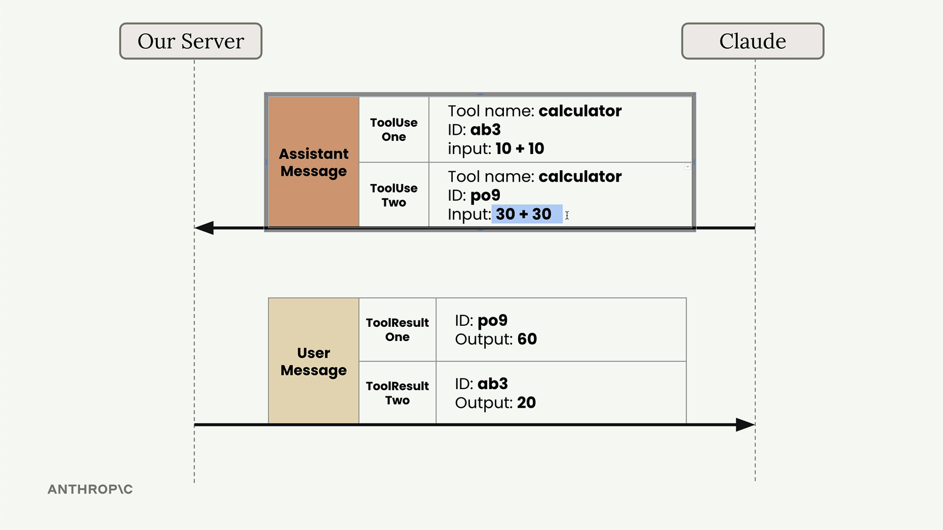 Claude는 단일 응답에서 여러 도구 호출을 요청할 수 있습니다. 예를 들어, 사용자가 "10 + 10은 얼마이고 30 + 30은 얼마인가요?"라고 물으면, Claude는 두 개의 별도 ToolUse 블록으로 응답할 수 있습니다.