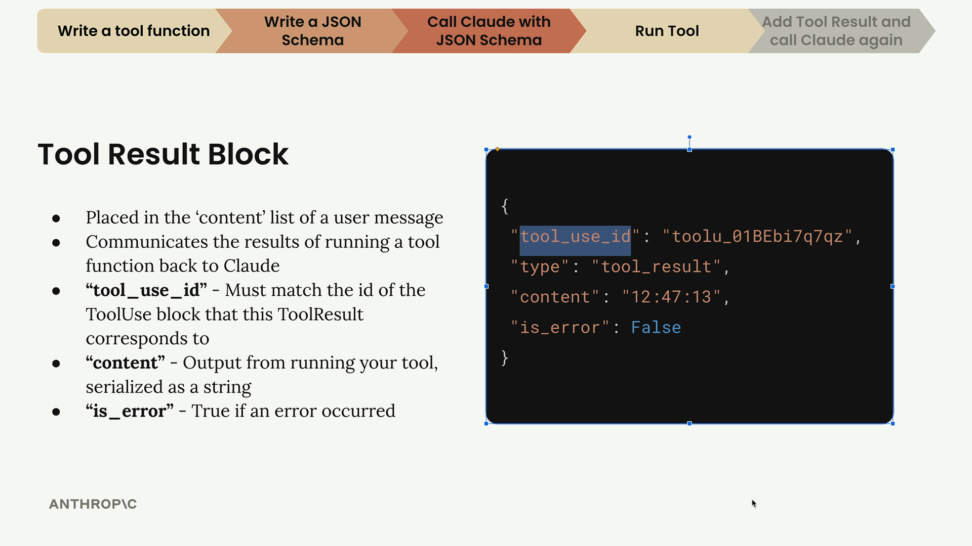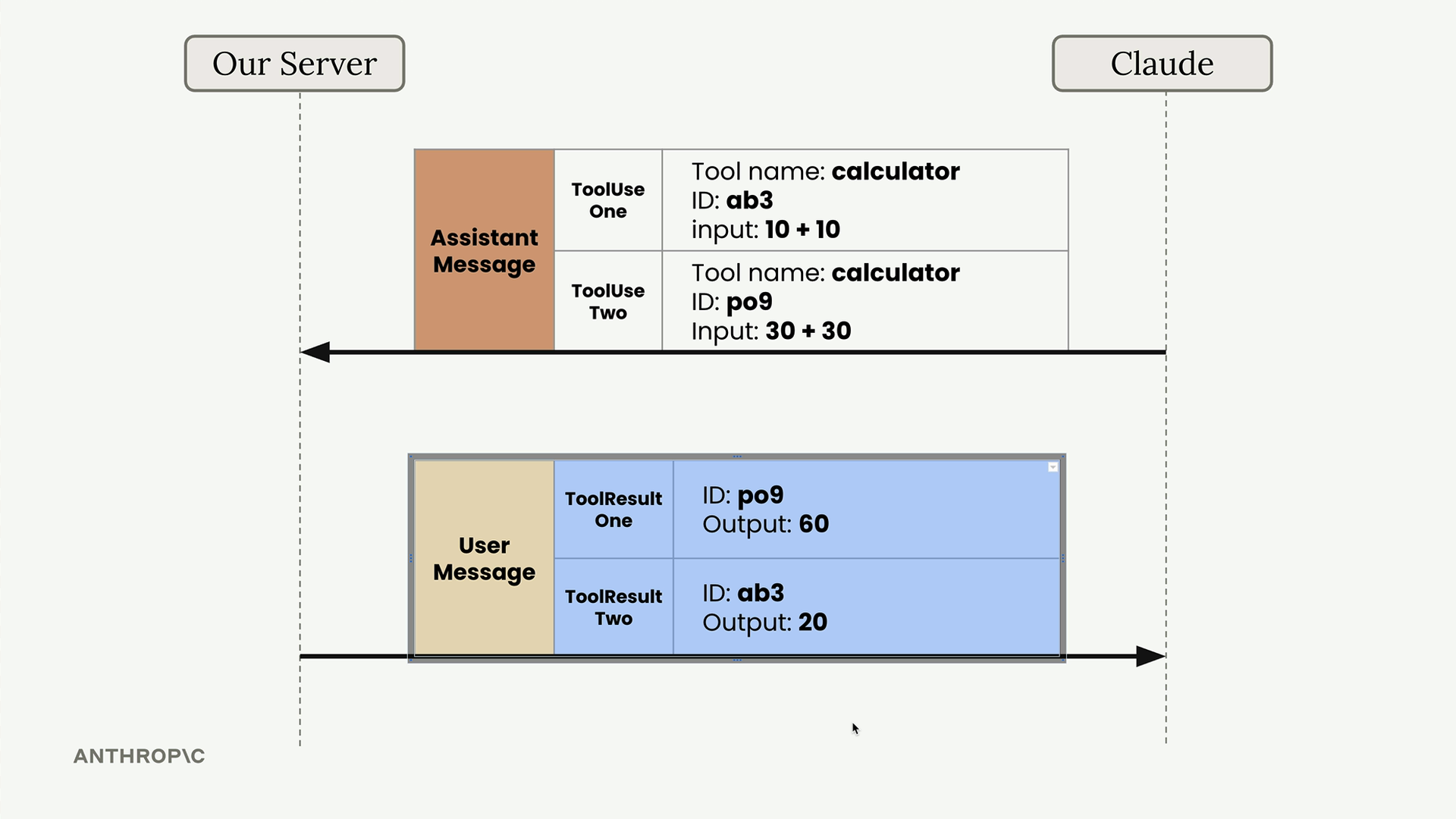 각 도구 호출에는 고유한 ID가 부여되며, 결과를 다시 전송할 때 이 ID를 맞춰야 합니다. 이를 통해 결과가 다른 순서로 도착하더라도 Claude가 어떤 결과가 어떤 요청에 해당하는지 알 수 있습니다.