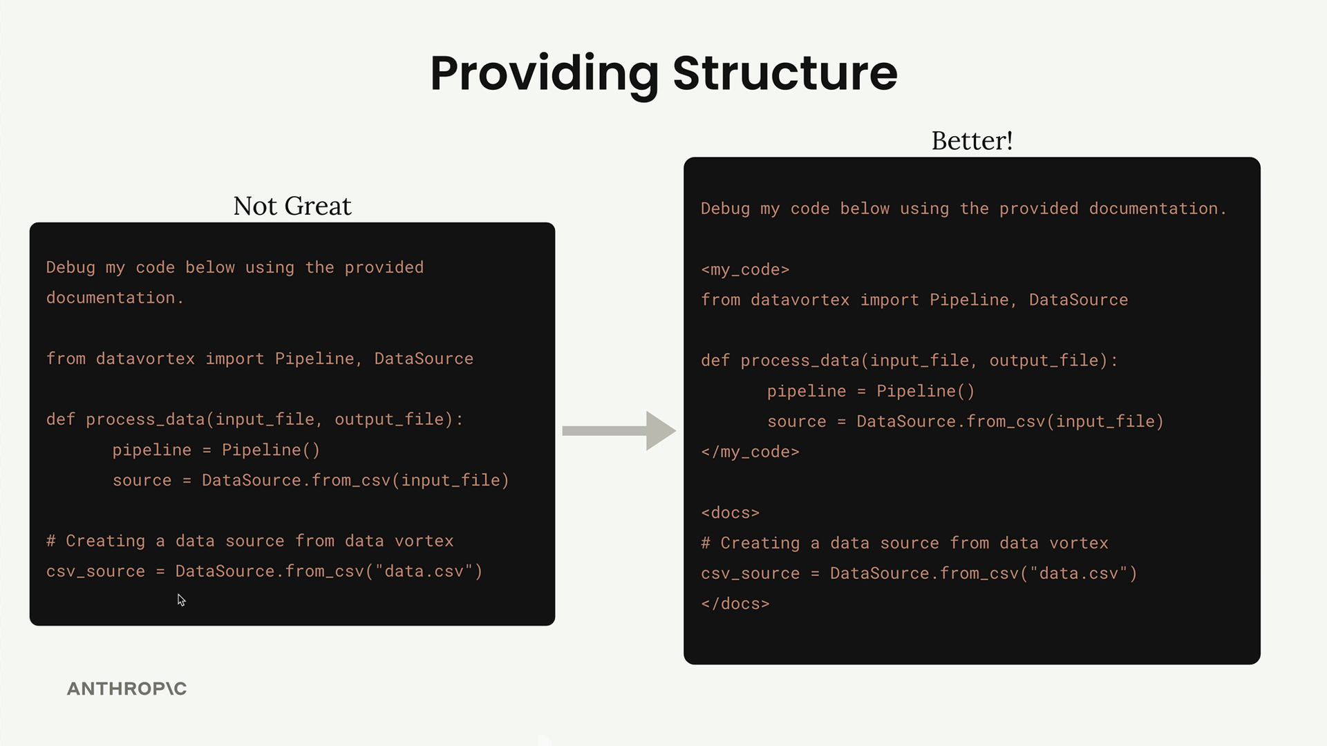 "좋지 않은" 버전은 코드와 문서를 거의 구분할 수 없게 만듭니다. "더 나은" 버전은 <my_code> 및 <docs> 태그를 사용하여 명확한 경계를 만듭니다.