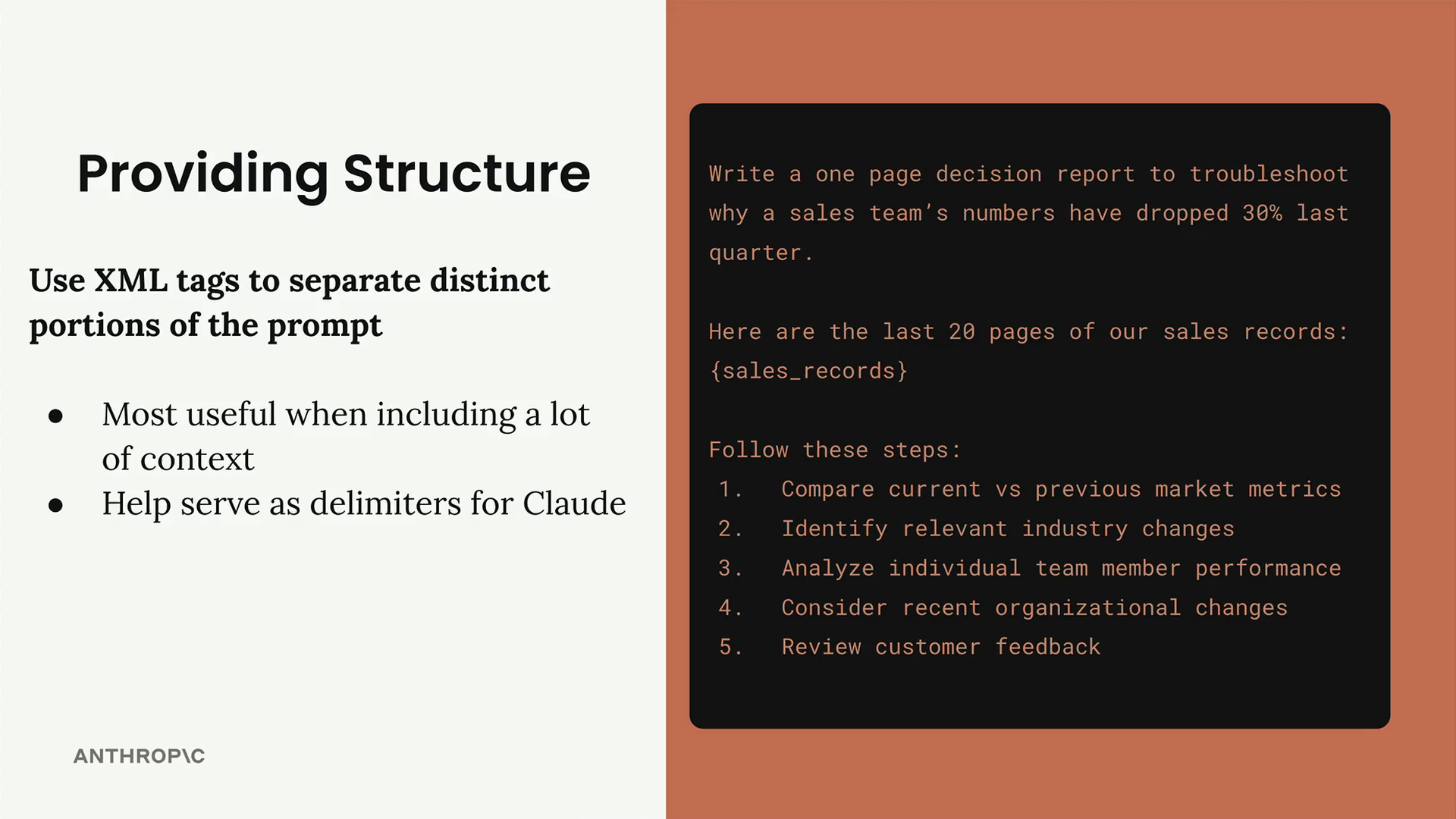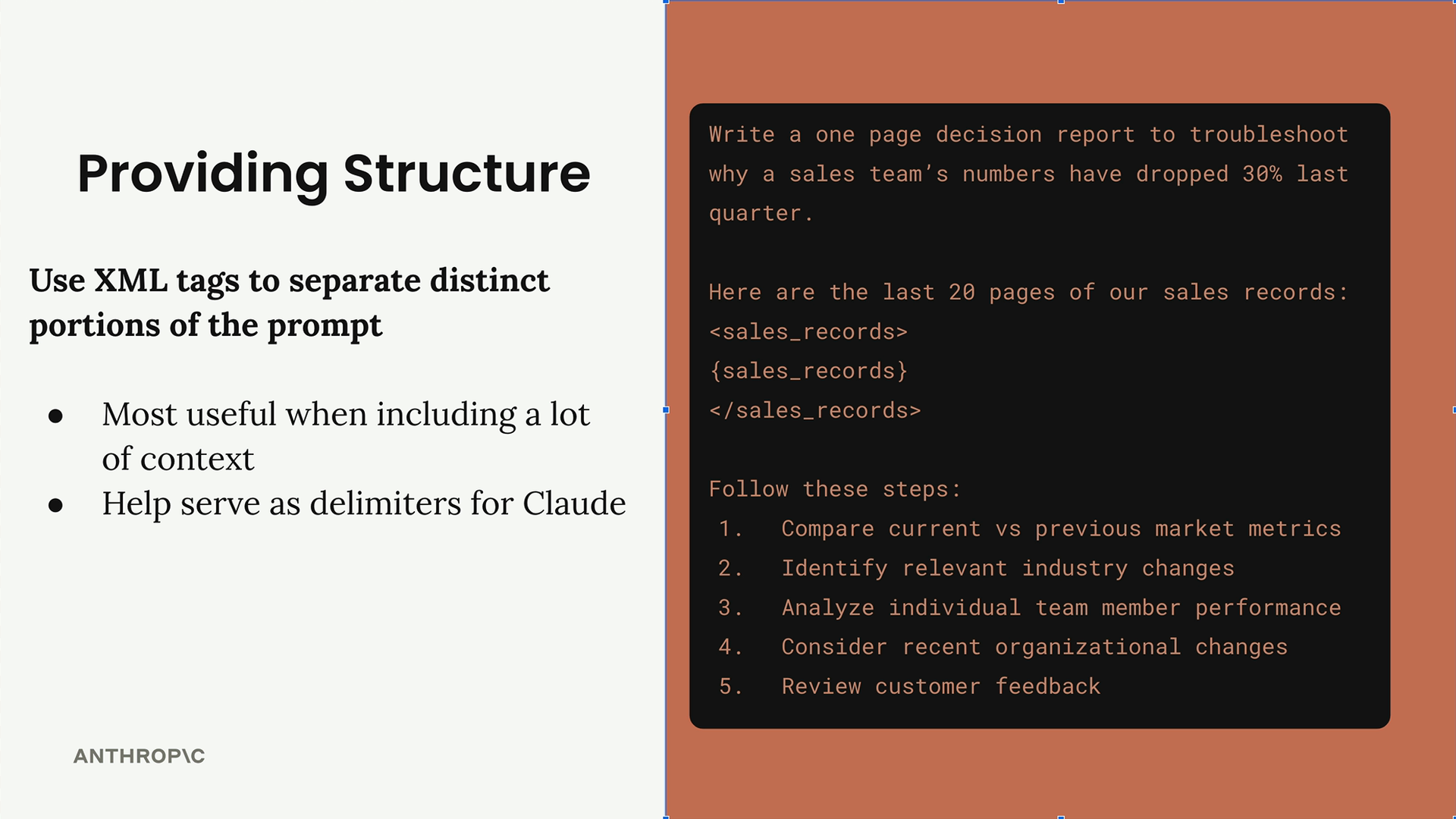 위의 예시는 불명확한 경계가 Claude의 의도 파악을 얼마나 어렵게 만드는지 보여줍니다. 판매 기록을 <sales_records> 및 </sales_records> 와 같은 XML 태그로 감싸면 Claude가 프롬프트의 구조를 이해하는 데 도움이 되는 명확한 구분자를 만들 수 있습니다.