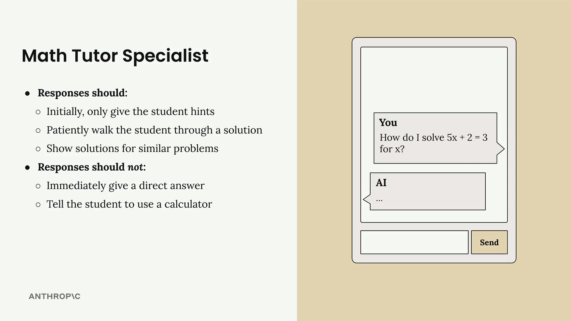 수학 튜터 챗봇을 만든다고 가정해봅시다. 학생이 "5x + 2 = 3에서 x를 어떻게 풀어요?"라고 물을 때, 단순히 답을 내뱉는 것이 아니라 실제 튜터처럼 행동하기를 원할 것입니다. 좋은 수학 튜터라면: