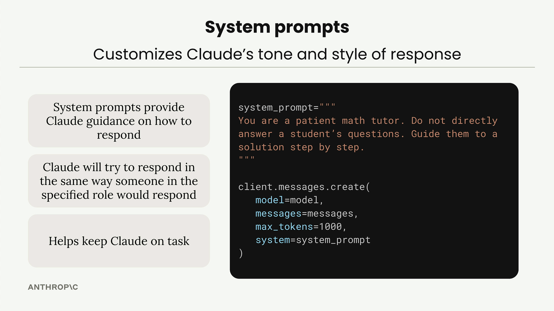 시스템 프롬프트는 Claude에게 응답 방법에 대한 지침을 제공합니다. 일반 문자열로 정의한 후 create 함수 호출에 전달합니다. 주요 이점은 다음과 같습니다: