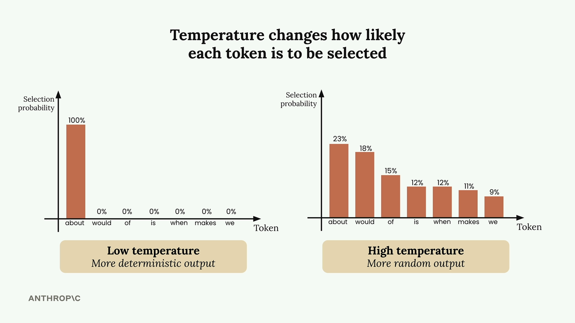 낮은 온도(0에 가까울 때)에서 Claude는 매우 결정론적으로 동작하여 거의 항상 가장 높은 확률의 토큰을 선택합니다. 높은 온도(1에 가까울 때)에서는 확률이 여러 선택지에 더 고르게 분산되어 더 다양하고 창의적인 출력이 나타납니다.