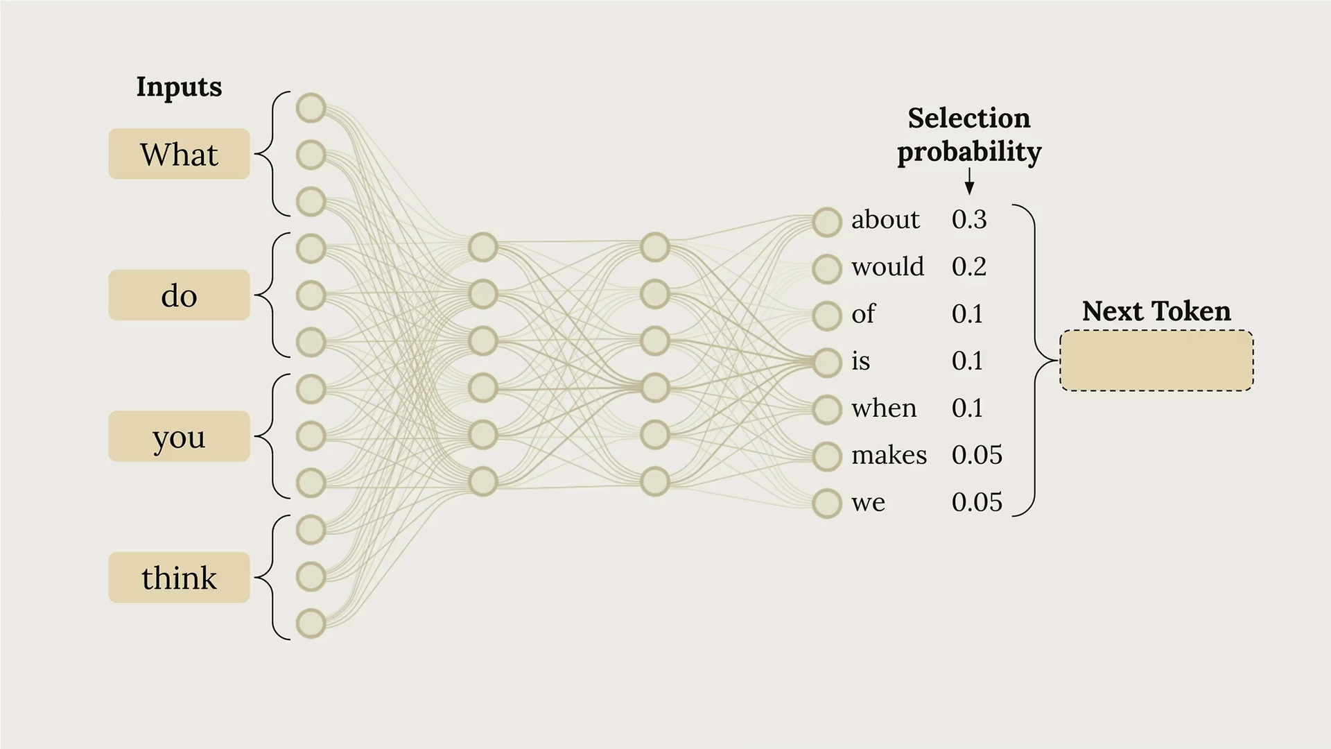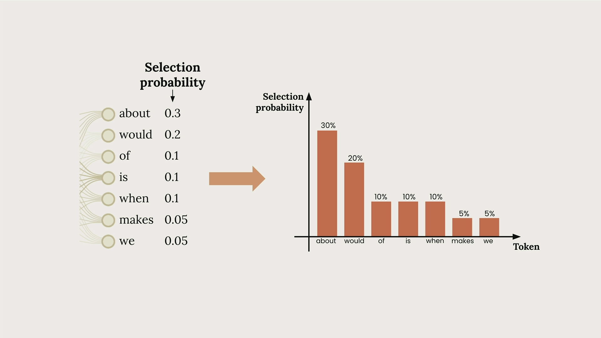 이 예시에서 Claude는 "about"에 30%, "would"에 20%, "of"에 10% 등의 확률을 부여할 수 있습니다. 그런 다음 모델은 하나의 토큰을 선택하고, 완전한 문장을 구성하기 위해 이 전체 과정을 반복합니다.