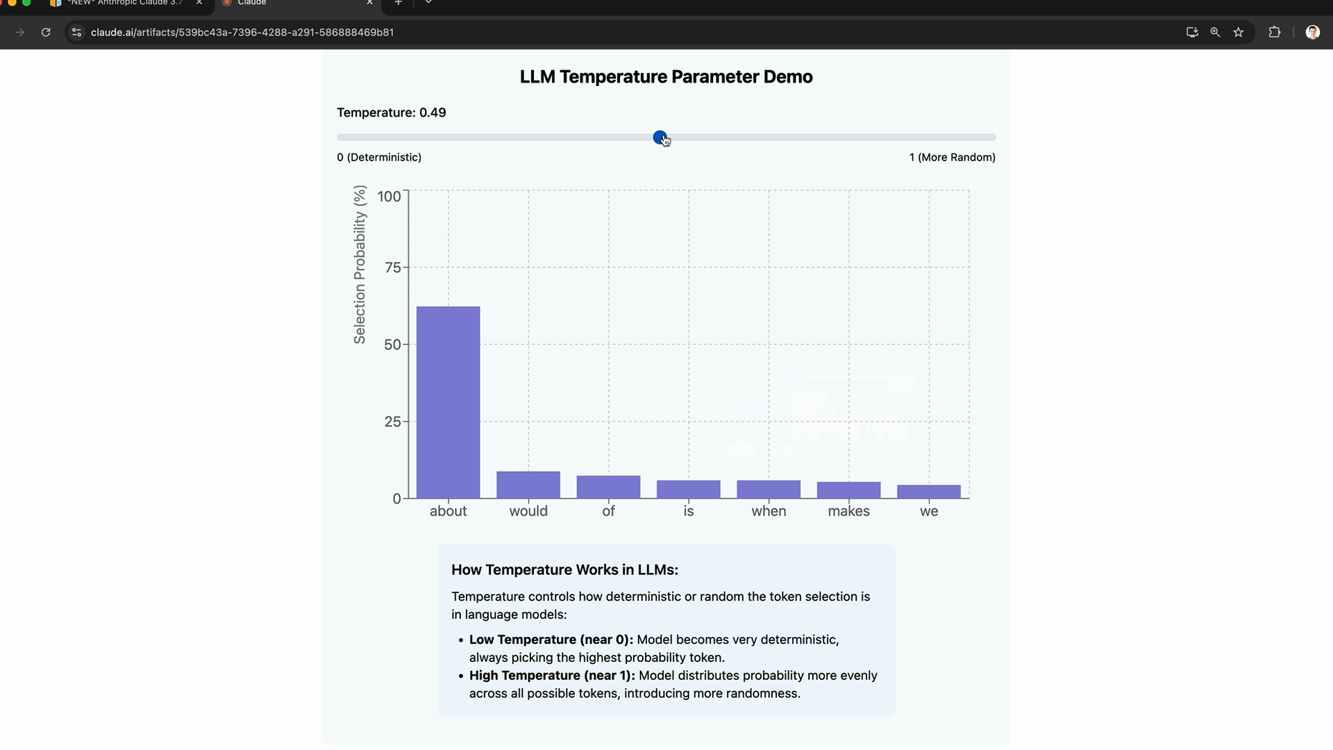 Claude의 인터랙티브 데모를 통해 온도의 작동 방식을 확인할 수 있습니다. 온도 슬라이더를 조정할 때 확률 분포가 어떻게 변하는지 살펴보세요: