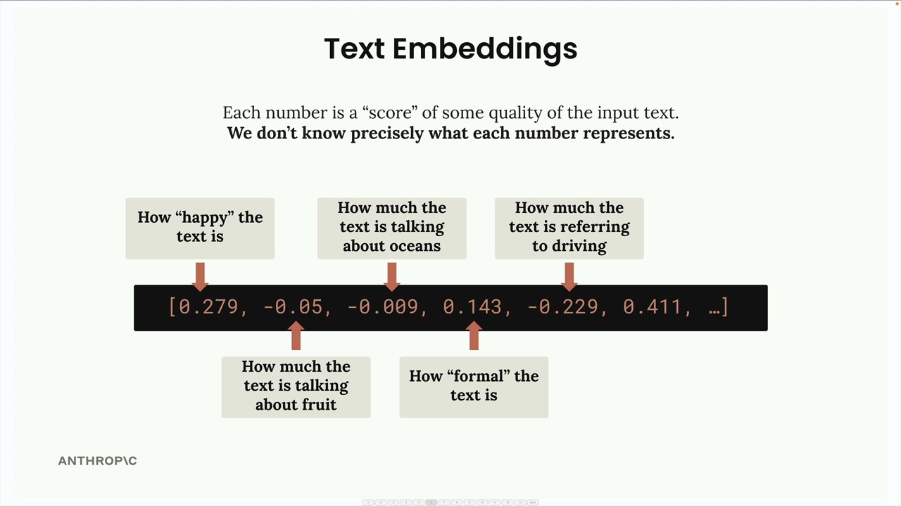 임베딩의 각 숫자는 본질적으로 입력 텍스트의 어떤 특성에 대한 "점수"입니다. 그러나 중요한 주의 사항이 있습니다. 각 숫자가 정확히 무엇을 나타내는지 우리는 알 수 없습니다.