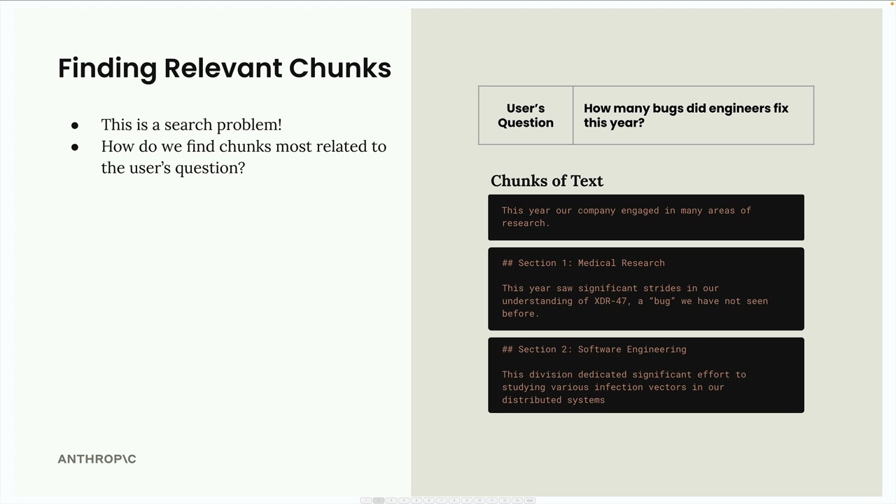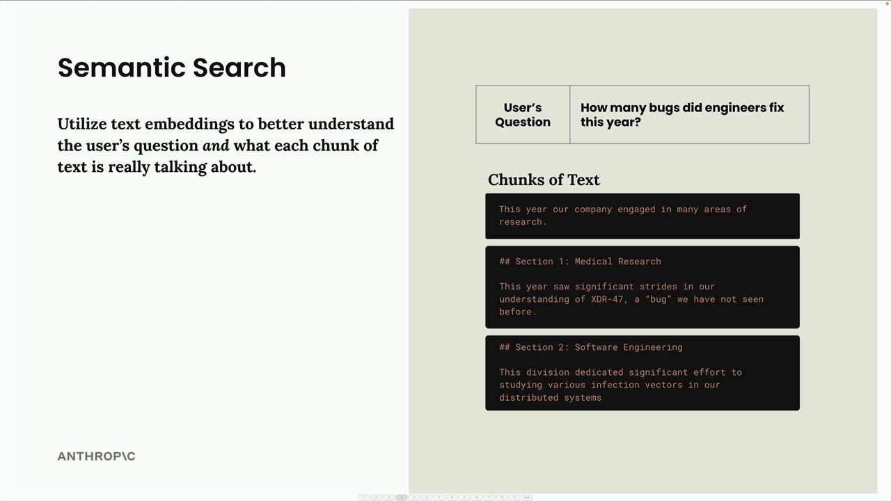 관련 청크를 찾는 가장 일반적인 방법은 시맨틱 검색입니다. 정확한 단어 일치를 찾는 키워드 기반 검색과 달리, 시맨틱 검색은 텍스트 임베딩을 사용하여 사용자의 질문과 각 텍스트 청크의 의미와 맥락을 이해합니다.