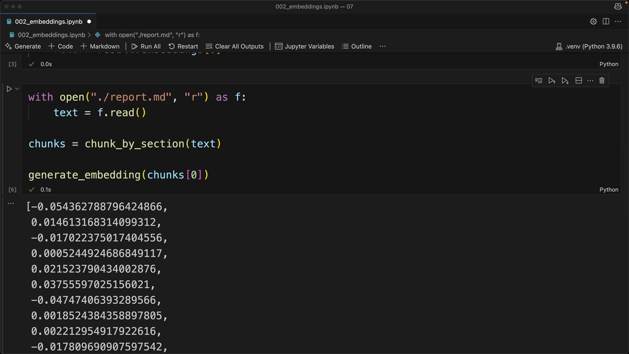 텍스트 청크에 이 함수를 실행하면 임베딩을 나타내는 부동소수점 숫자 목록이 반환됩니다. 프로세스는 빠르고 간단합니다. 진짜 도전은 RAG 파이프라인에서 가장 관련성 높은 콘텐츠를 찾기 위해 이러한 임베딩을 효과적으로 사용하는 방법을 이해하는 것입니다.