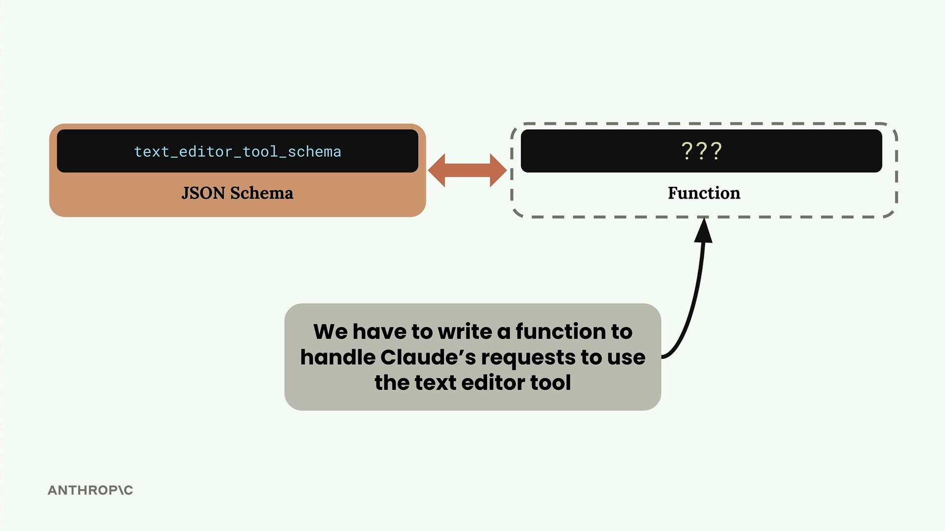 다른 도구를 사용할 때는 JSON 스키마와 함수 구현을 모두 작성합니다. 텍스트 편집 도구의 경우, Claude가 스키마 지식을 제공하지만, 파일 생성, 디렉토리 읽기, 텍스트 교체 등 Claude의 요청을 처리하는 함수는 직접 작성해야 합니다.