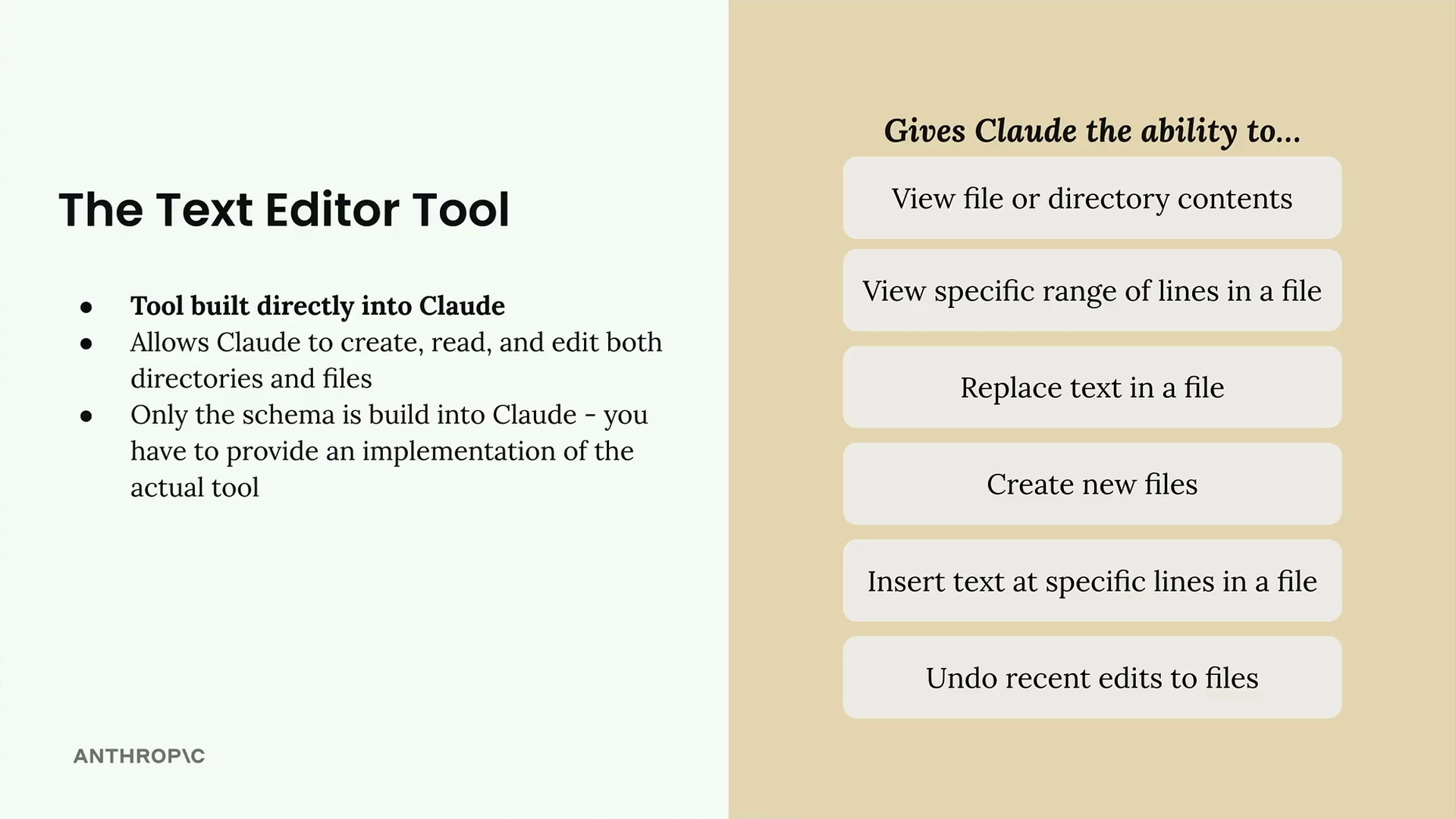 Claude에는 처음부터 직접 만들 필요 없는 내장 도구가 하나 있습니다: 텍스트 편집 도구입니다. 이 도구는 Claude가 일반 텍스트 편집기처럼 파일과 디렉토리를 다룰 수 있는 능력을 부여합니다.