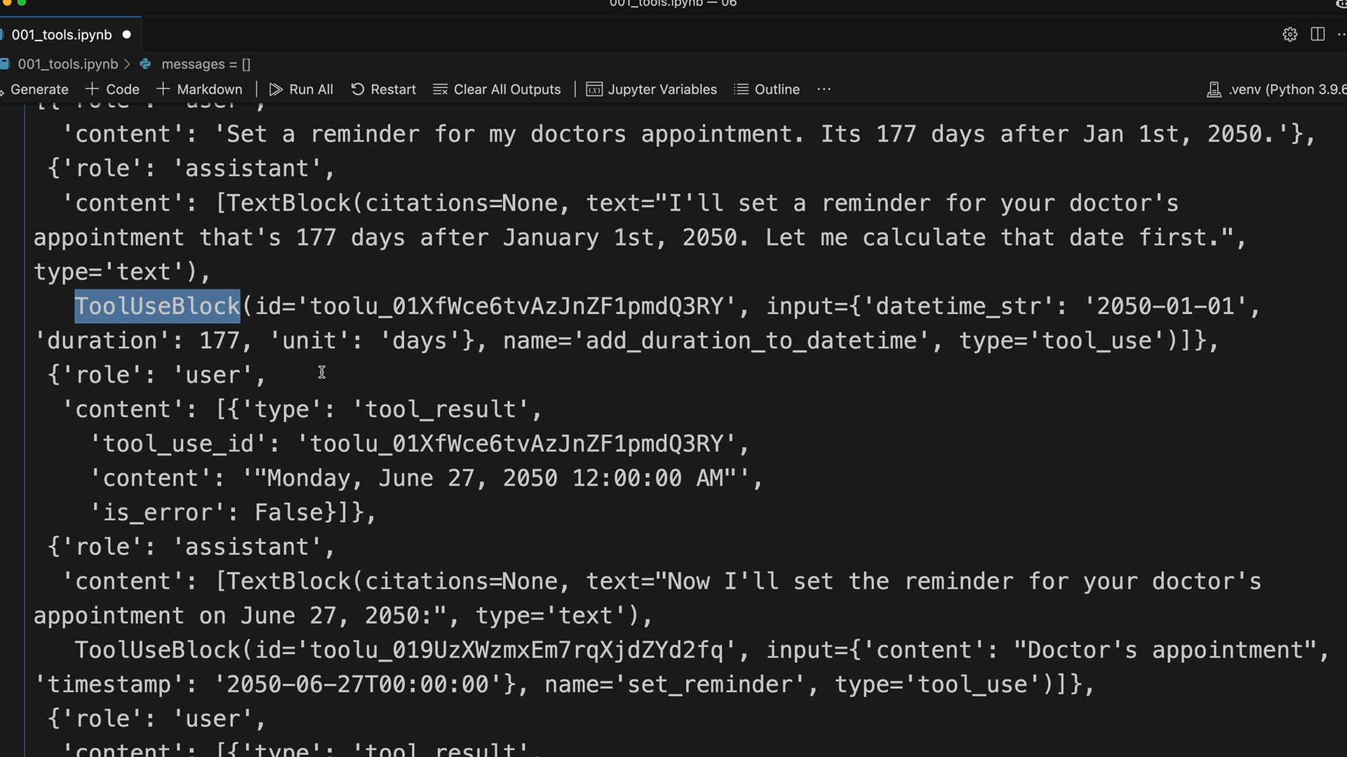 Claude는 먼저 해야 할 일을 설명한 다음 순서대로 적절한 도구를 호출하여 이를 처리합니다. 대화에서 Claude가 목표 날짜로 2050년 6월 27일을 계산한 후 해당 날짜에 리마인더를 설정하는 것을 확인할 수 있습니다.