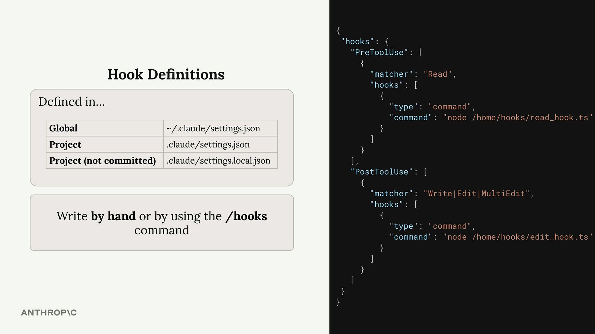 이 파일들에 직접 훅을 작성하거나 Claude Code 내에서 /hooks 명령을 사용할 수 있습니다.